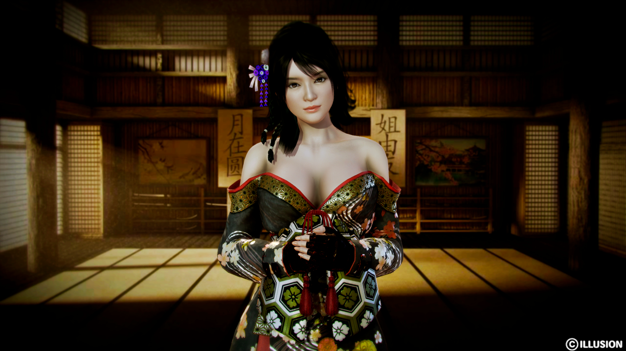 Description: A woman in a kimono is holding a camera in a room with wooden floors and a large window.