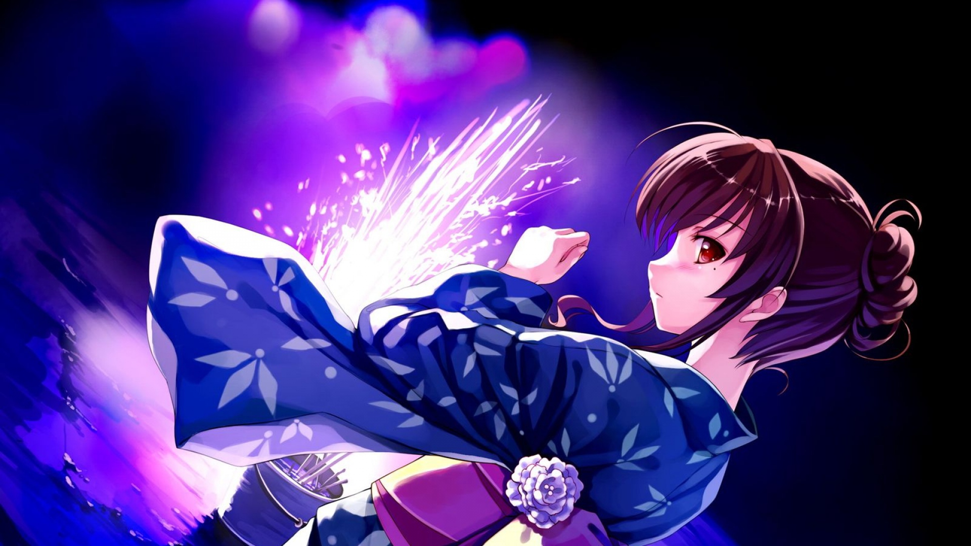 Description: A woman in a kimono is dancing with fireworks in the background and a purple light shining on her.