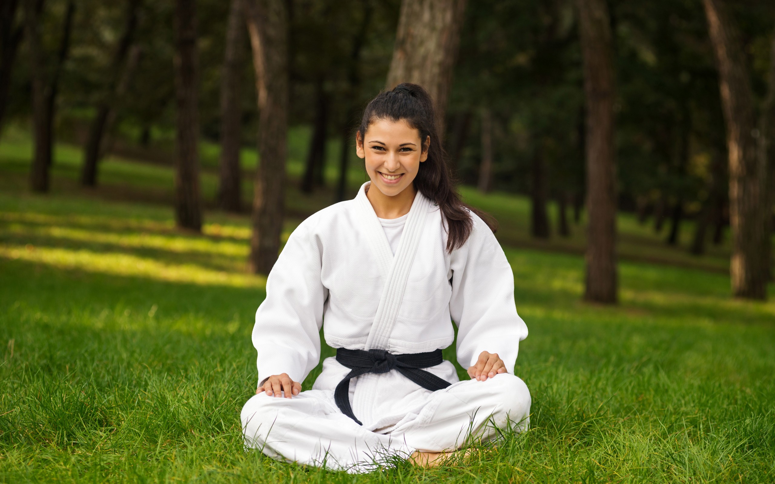 Description: A woman in a white kimono sitting in a field of grass with trees in the background and a black belt around her waist.