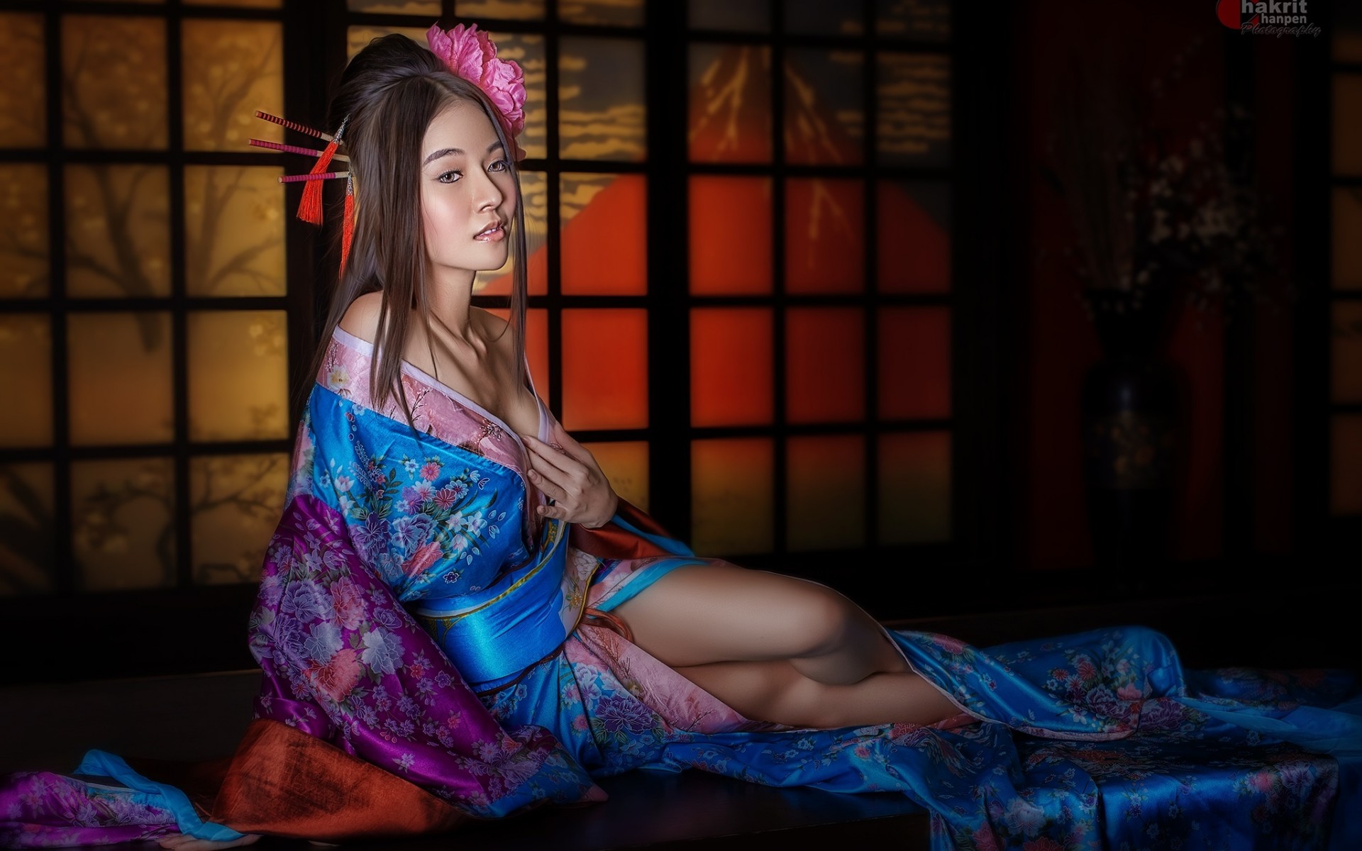 Description: A woman in a kimono sitting on a table in front of a window with a red flower in her hair.