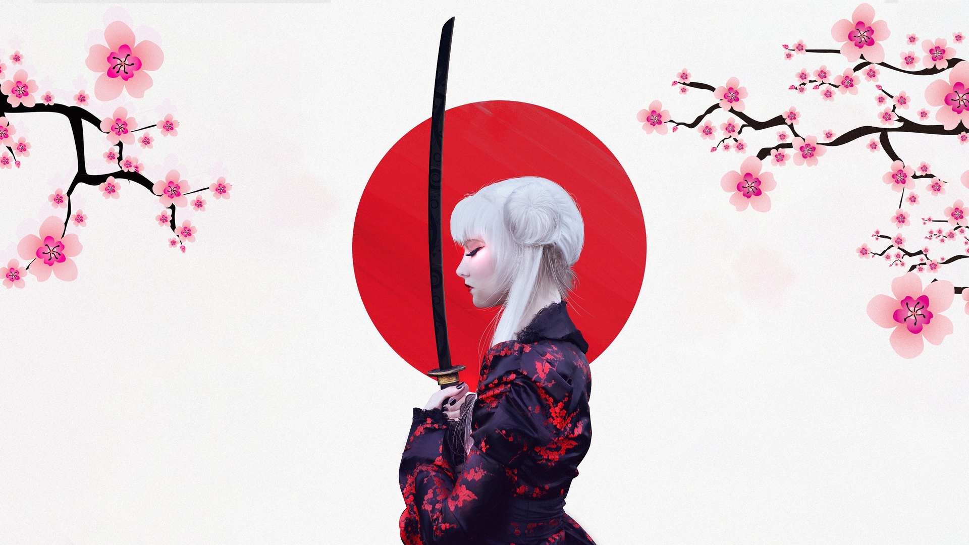 Description: A woman in a kimono holding a sword in front of a cherry blossom tree with a red circle.