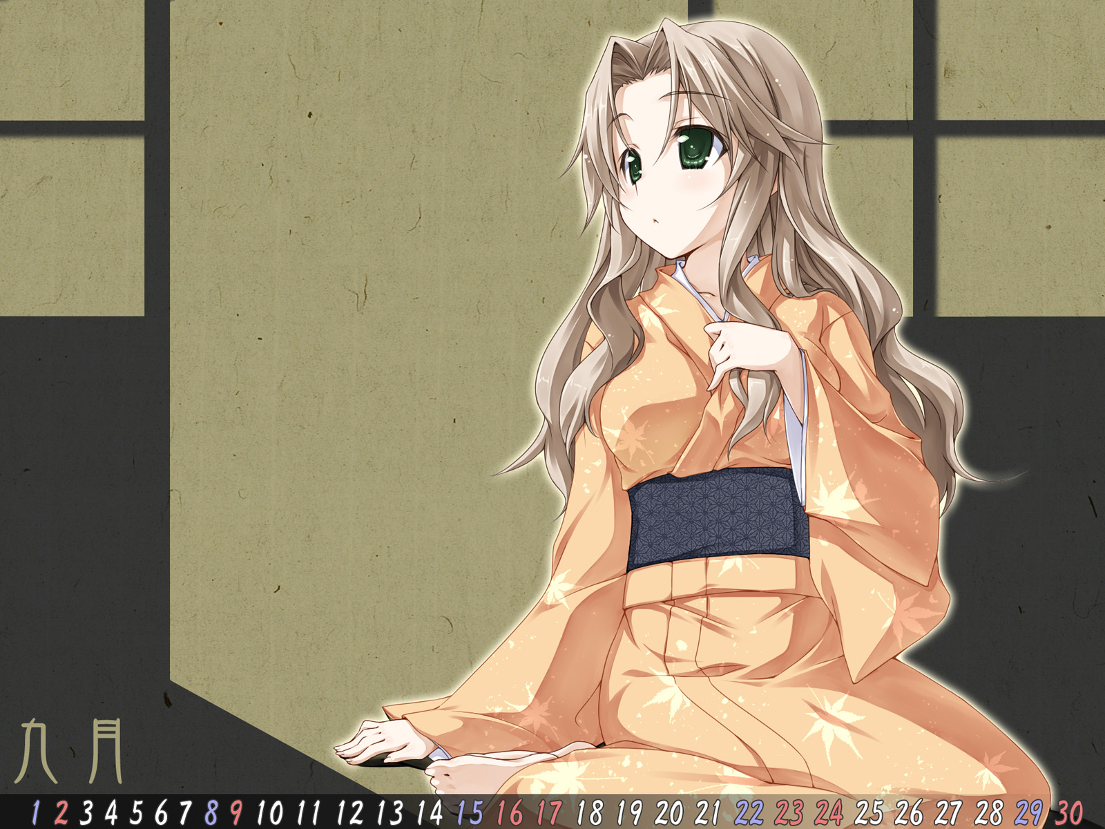 Description: A woman in a kimono sitting on a table with a knife in her hand and a clock in the background.