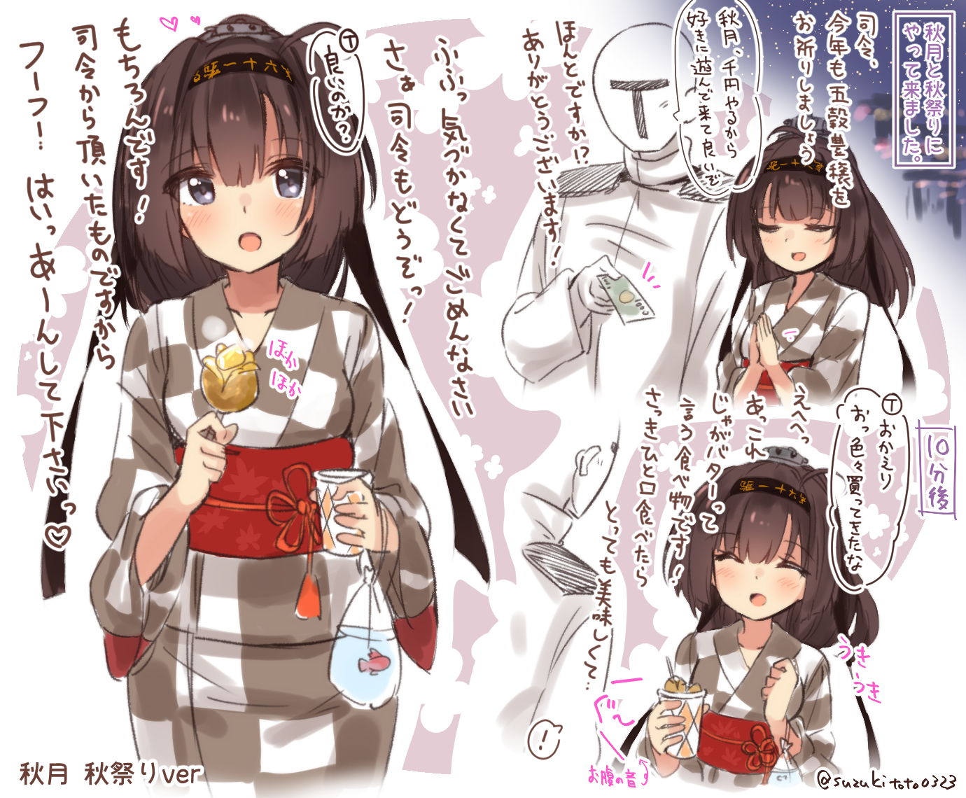 Description: A woman in a kimono holding a cup of tea and a card in her hand with a man in the background.
