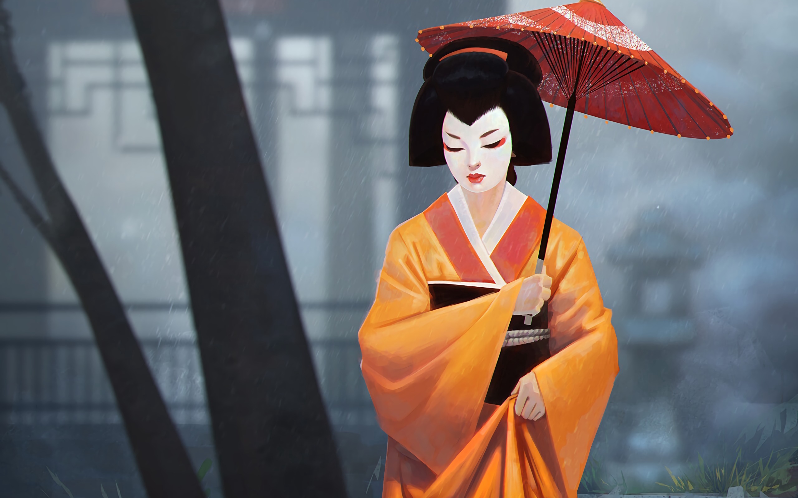 Description: A woman in a kimono holding an umbrella in the rain.