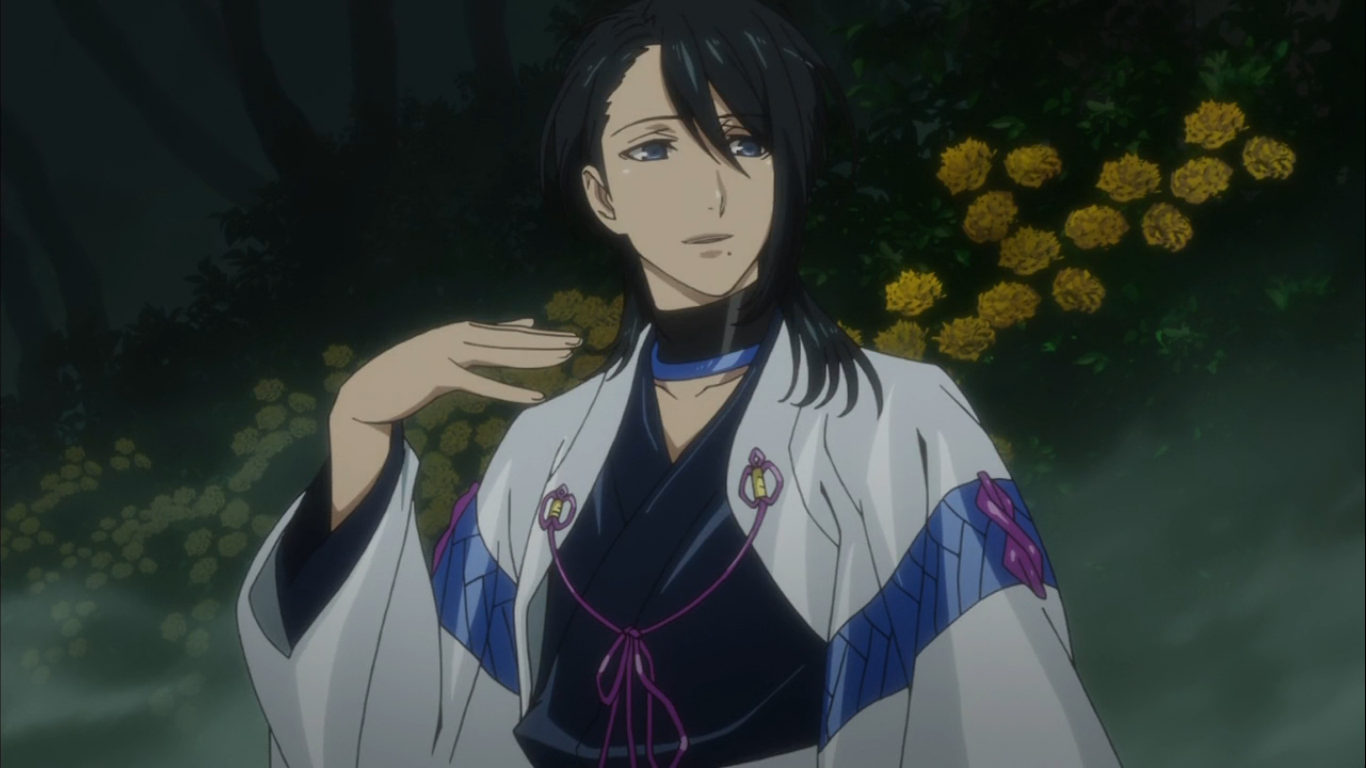 Description: A woman in a kimono standing in front of a bush with yellow flowers in the background and a dark background.