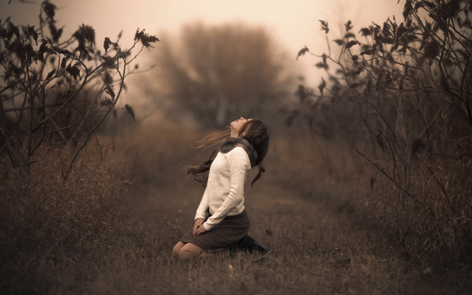 Description: A woman kneeling down in a field with her eyes closed and her hair blowing in the wind.