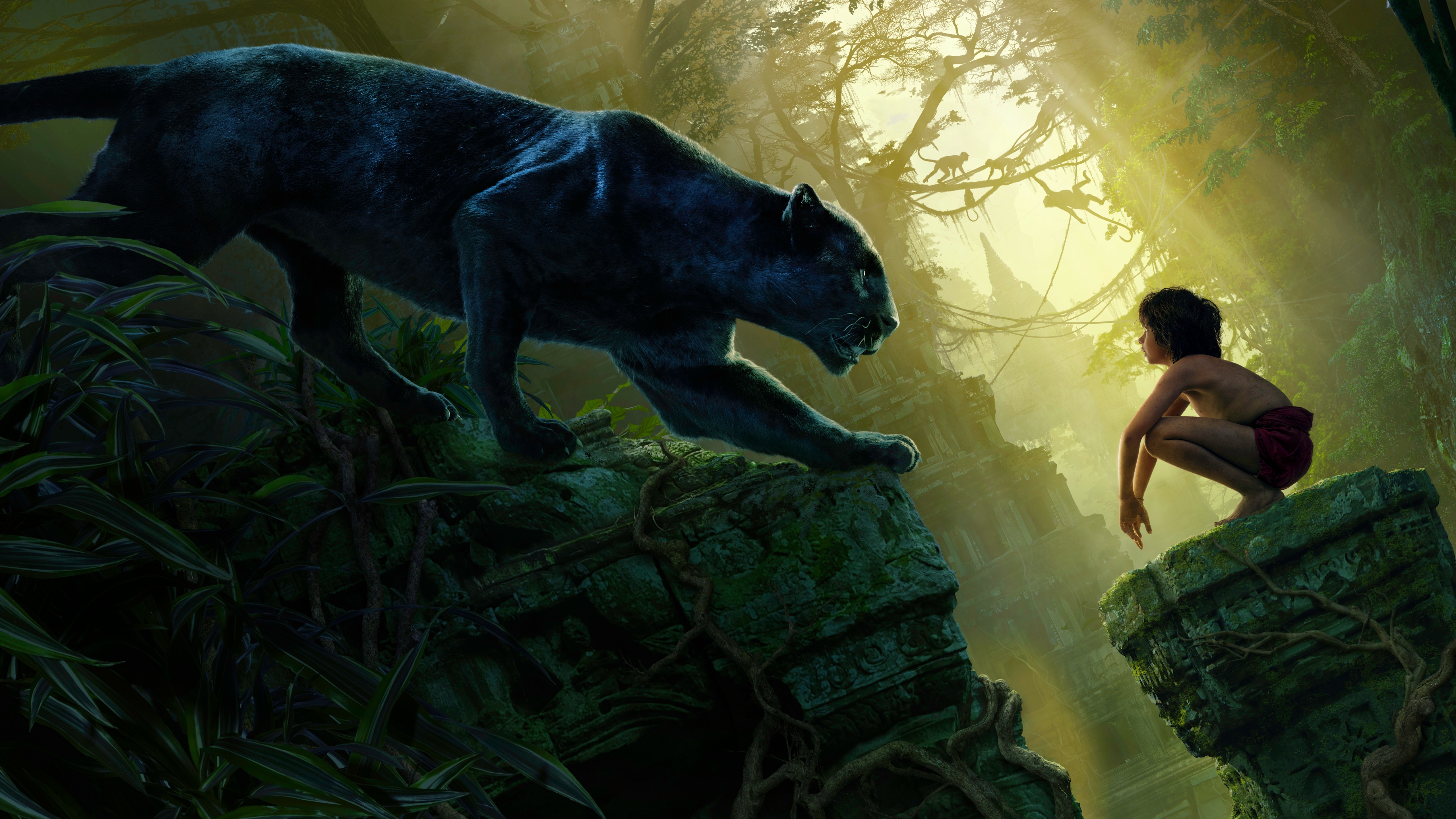 Description: A woman kneeling down next to a black cat in a forest with a light shining on her face and a jungle background.