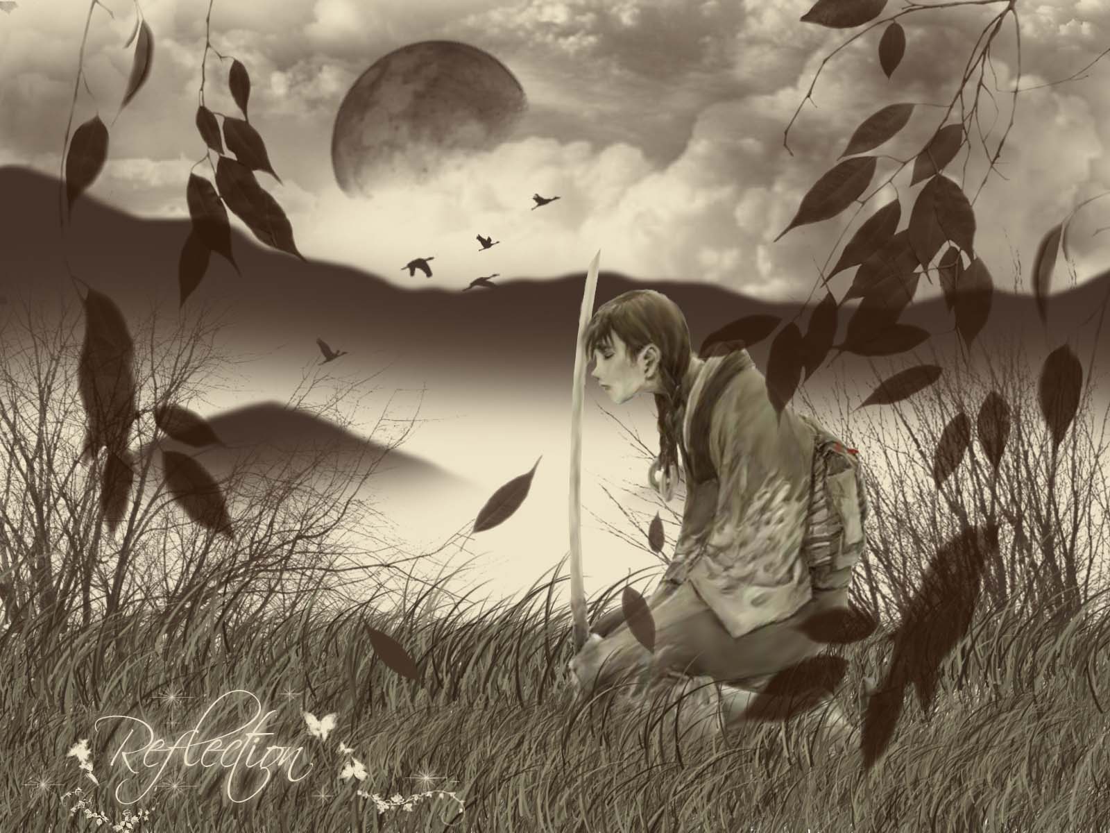 Description: A woman kneeling down in a field with a stick in her hand and a full moon in the background.