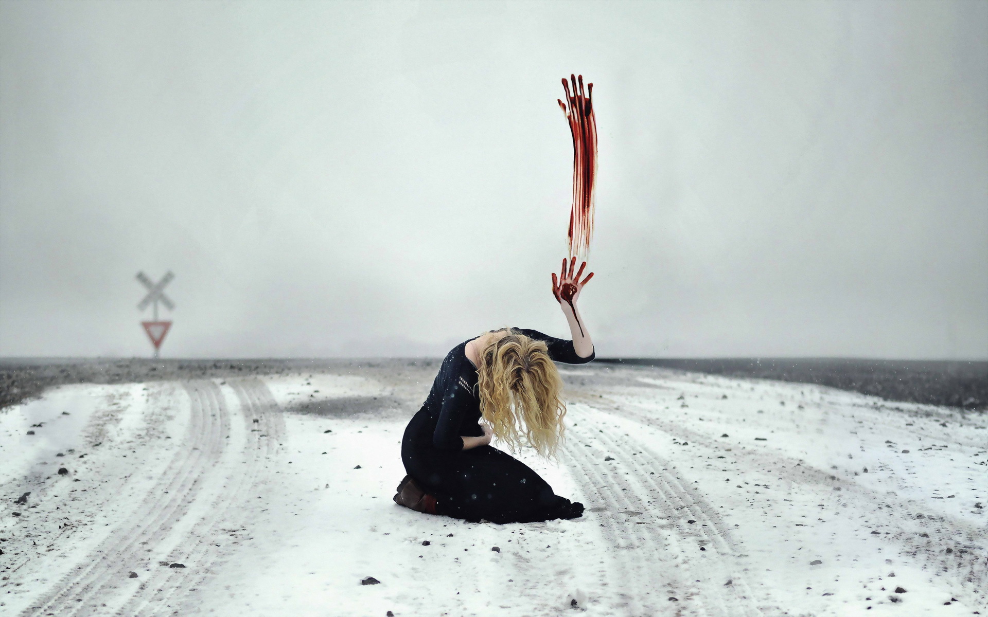 Description: A woman kneeling down on a snowy road holding a large object in the air with her hands in the air.