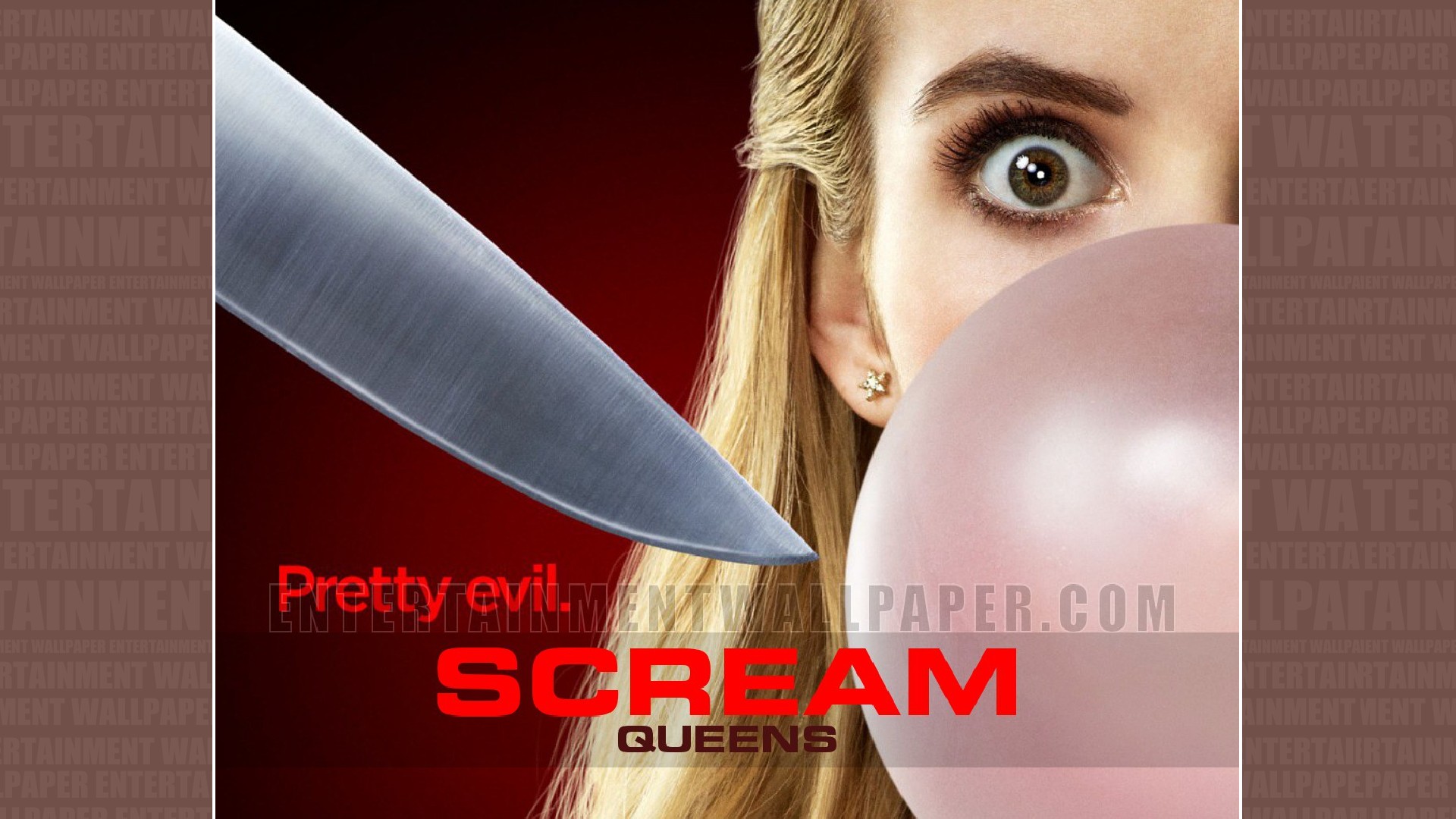 Description: A woman with a knife and a balloon in front of her face with a red background and a red text underneath it.