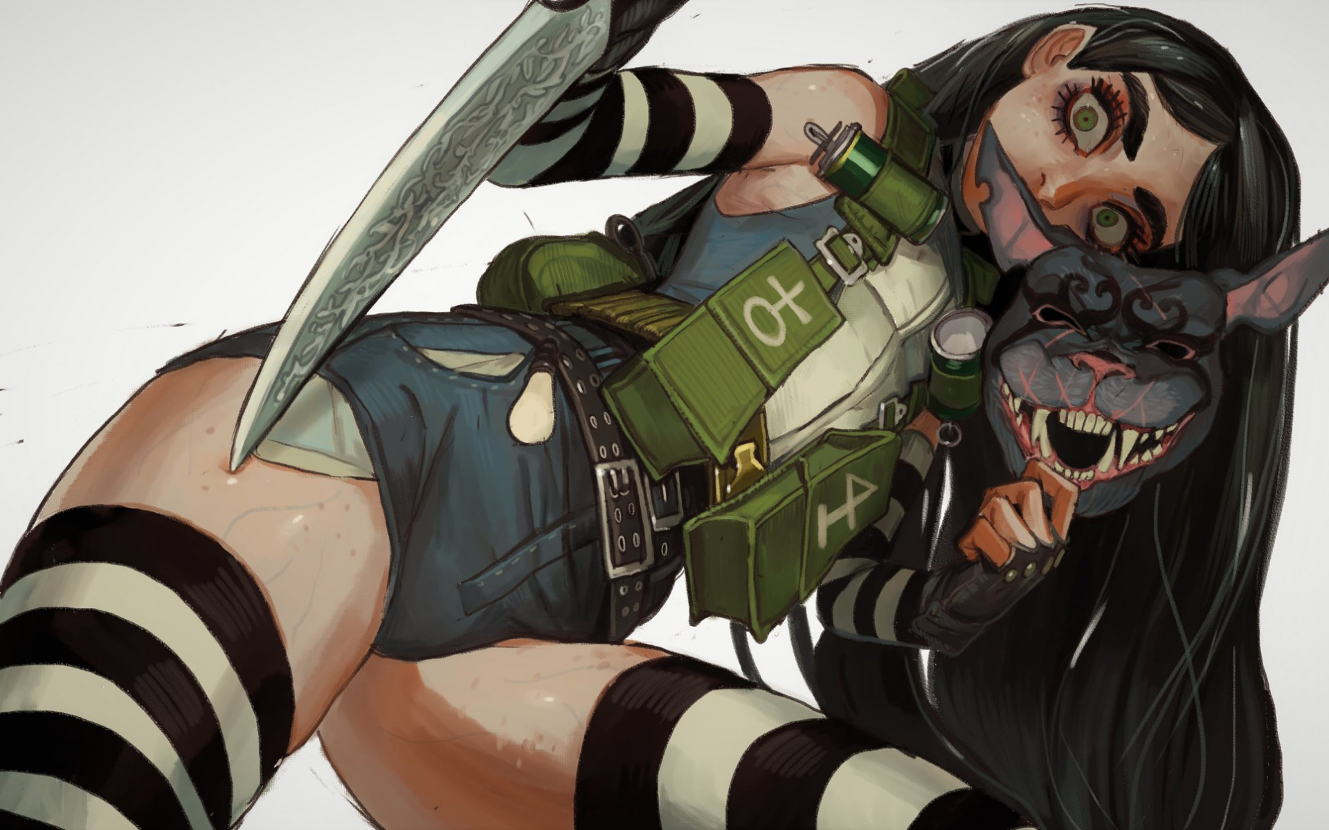 Description: A woman with a knife and a cat on her chest and a green bag on her shoulder and a green bag on her shoulder.
