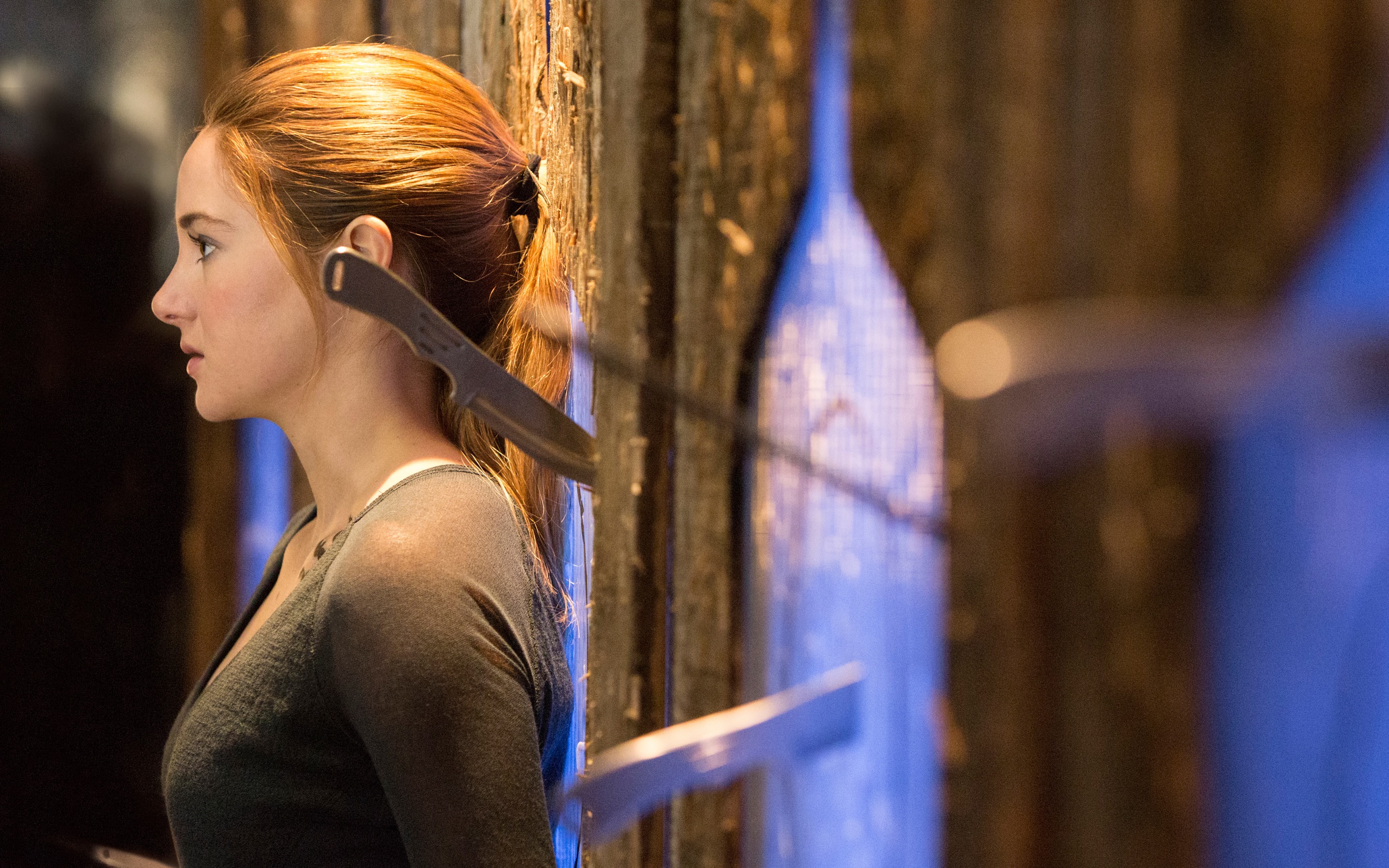 Description: A woman with a knife in her hair standing next to a wall with a blue light behind her and a wooden wall behind her.