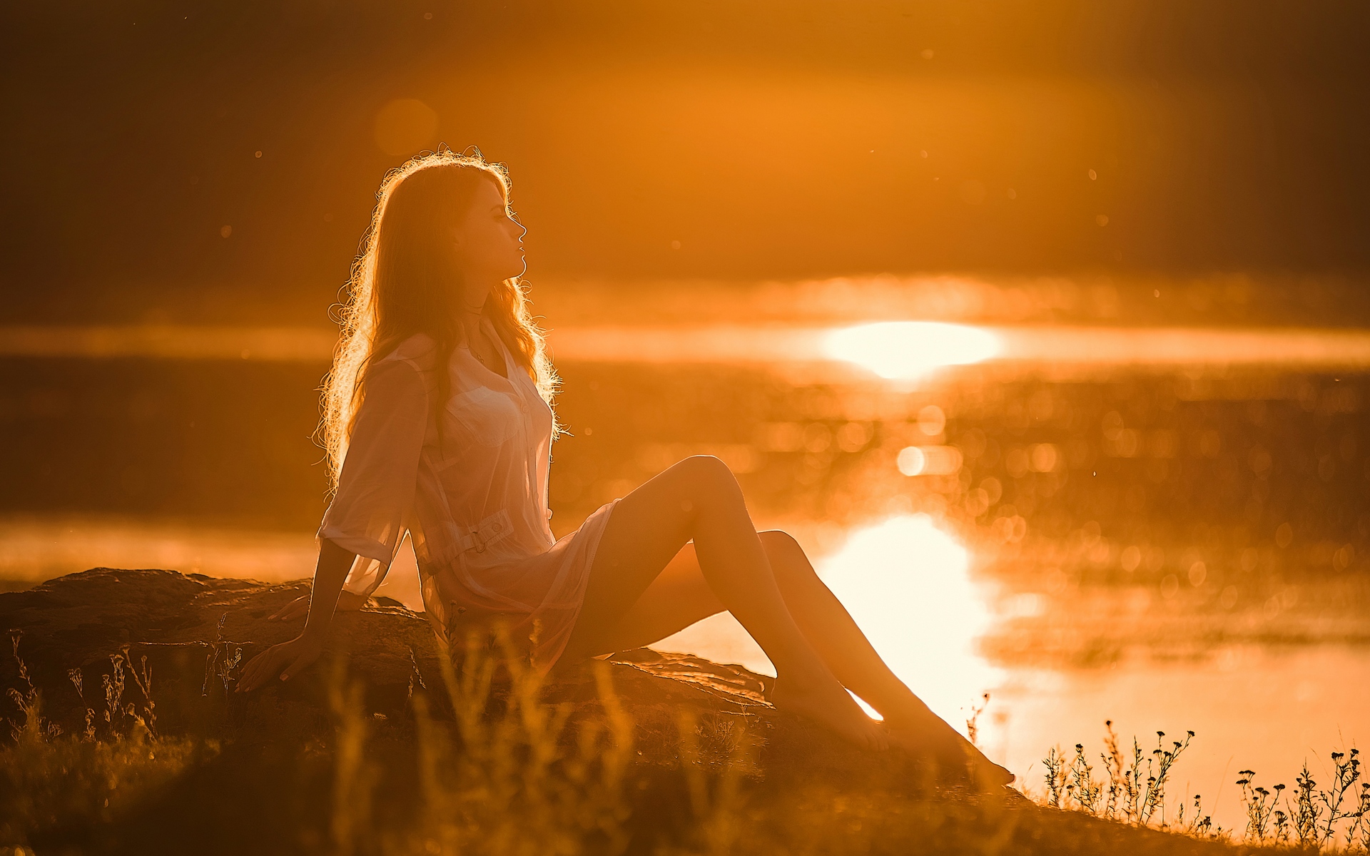 Description: A woman sitting on a log in front of a lake at sunset or sunrise or sunset.