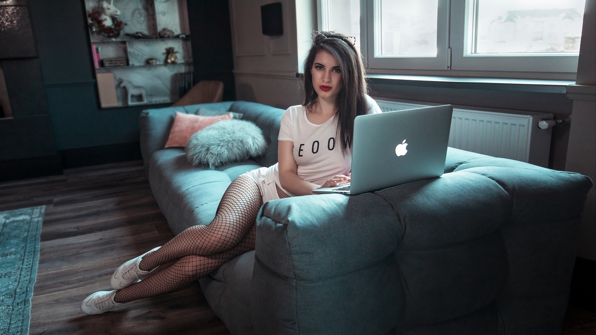 Description: A woman sitting on a couch with a laptop computer in her lap and a fish net stockings on her leg.