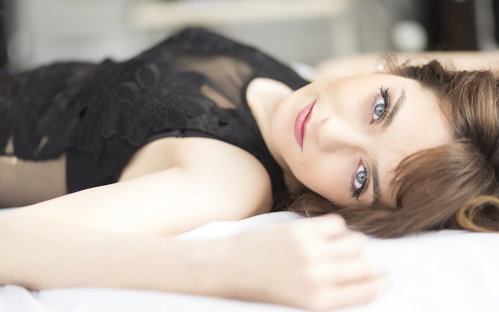 Description: A woman laying on a bed with her eyes closed and her hair in a bunt.