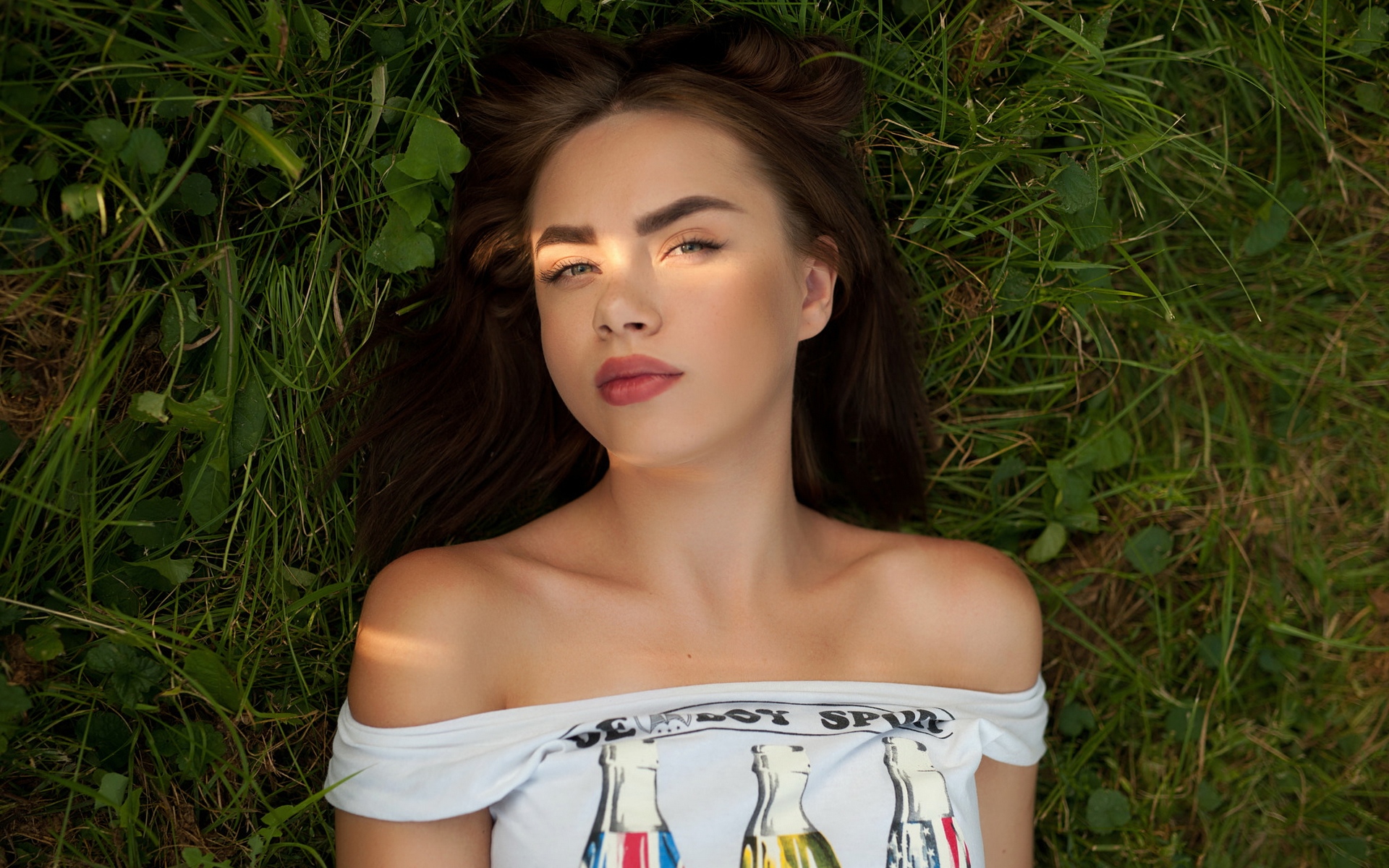 Description: A woman laying on the grass with her eyes closed and her hair blowing in the wind.
