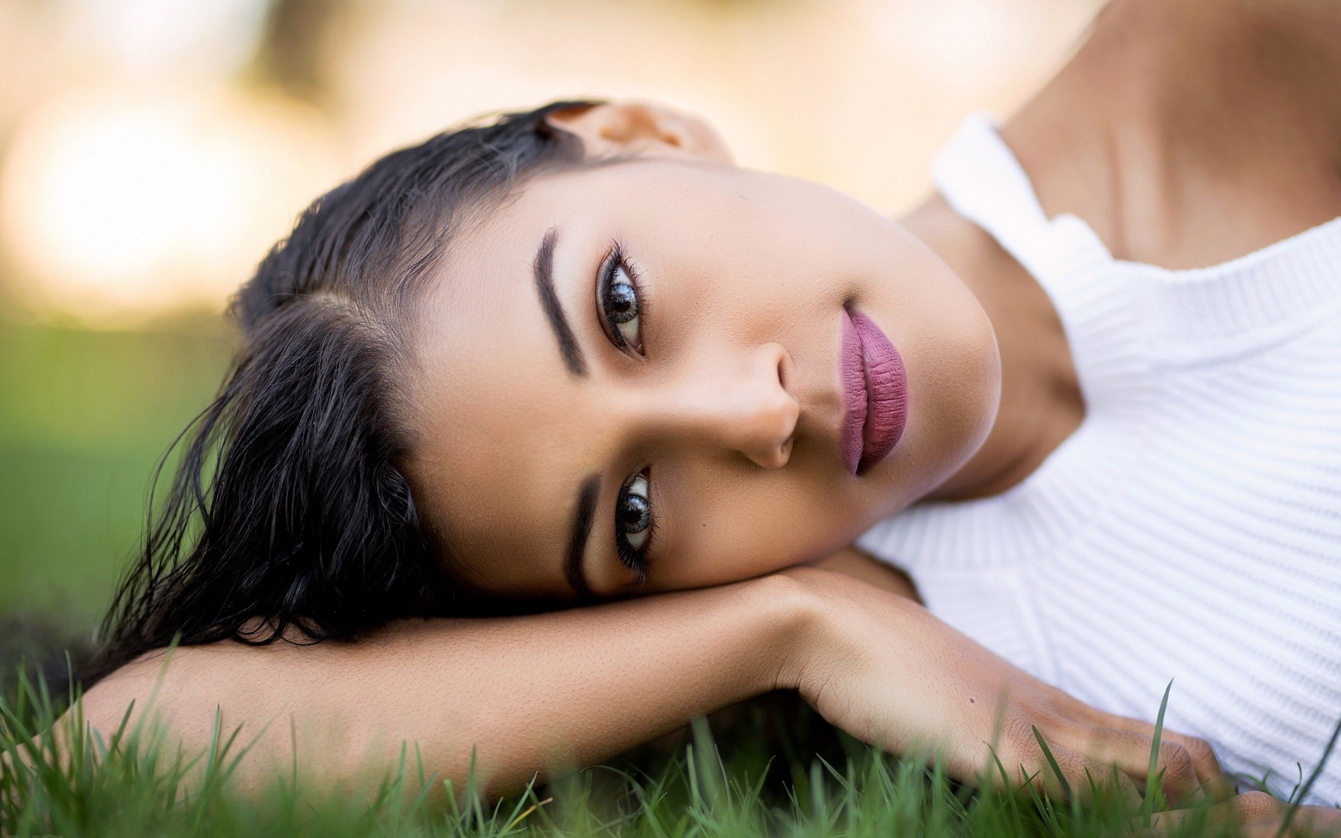 Description: A woman laying on the grass with her eyes closed and her head resting on her arm and her hand on her chest.