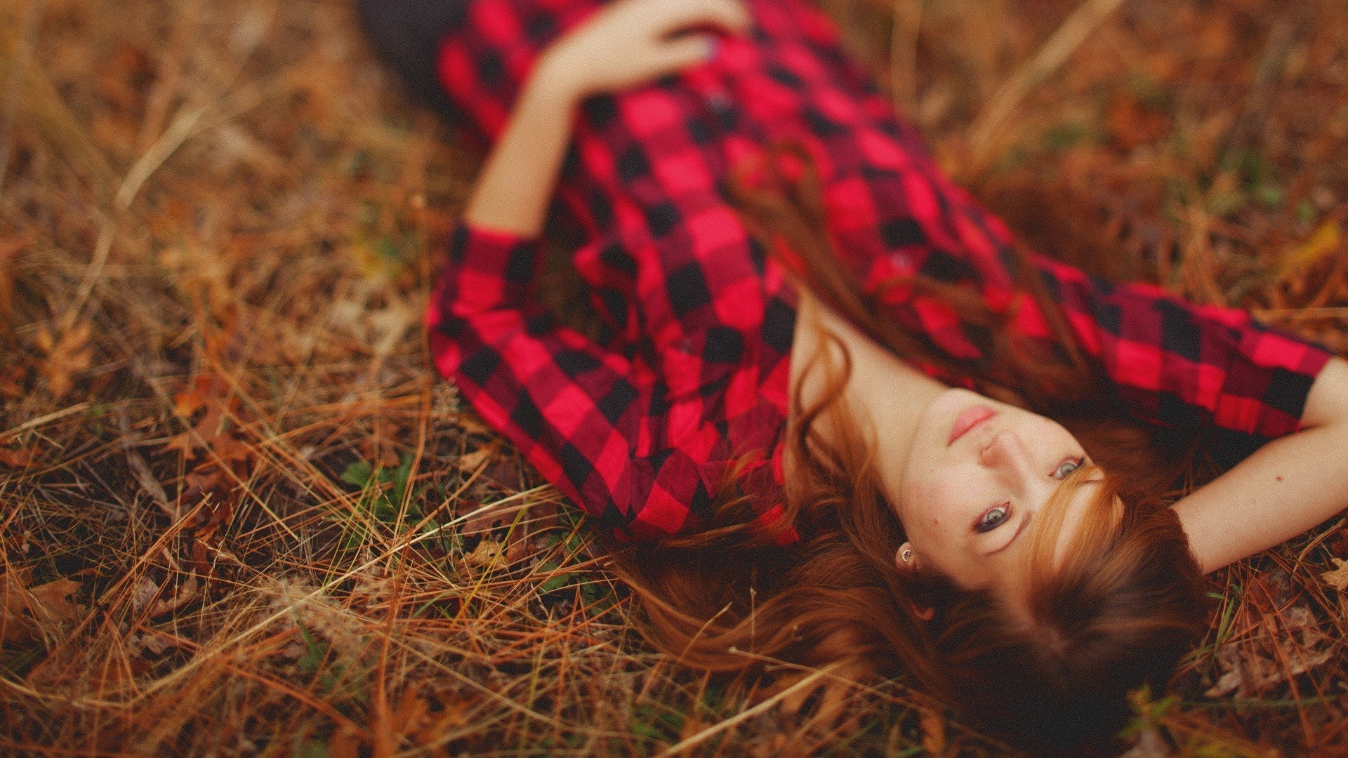 Description: A woman laying on the ground in a red and black dress with her hair in the air and eyes closed.