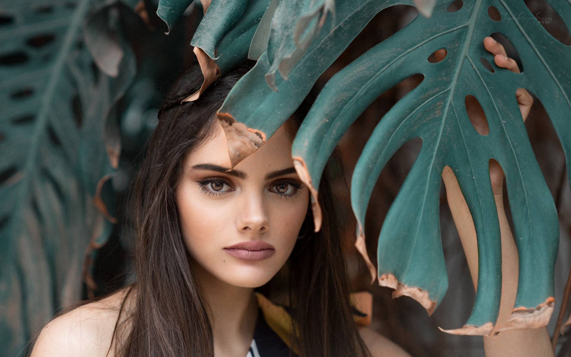 Description: A woman with long hair and a leaf on her head is posing for a picture in front of a green plant.