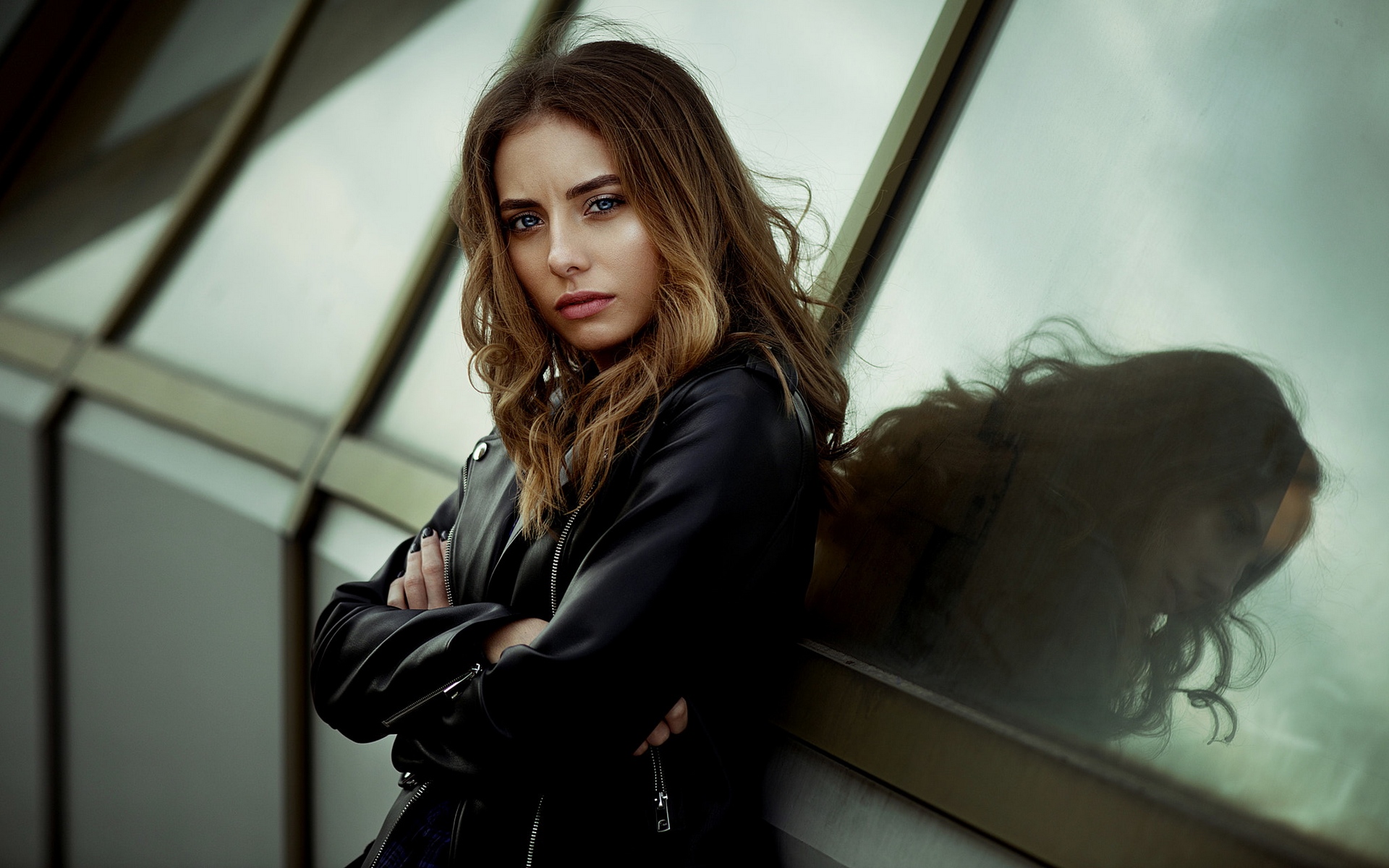 Description: A woman leaning against a wall with her arms crossed and looking at the camera with a man in the background.