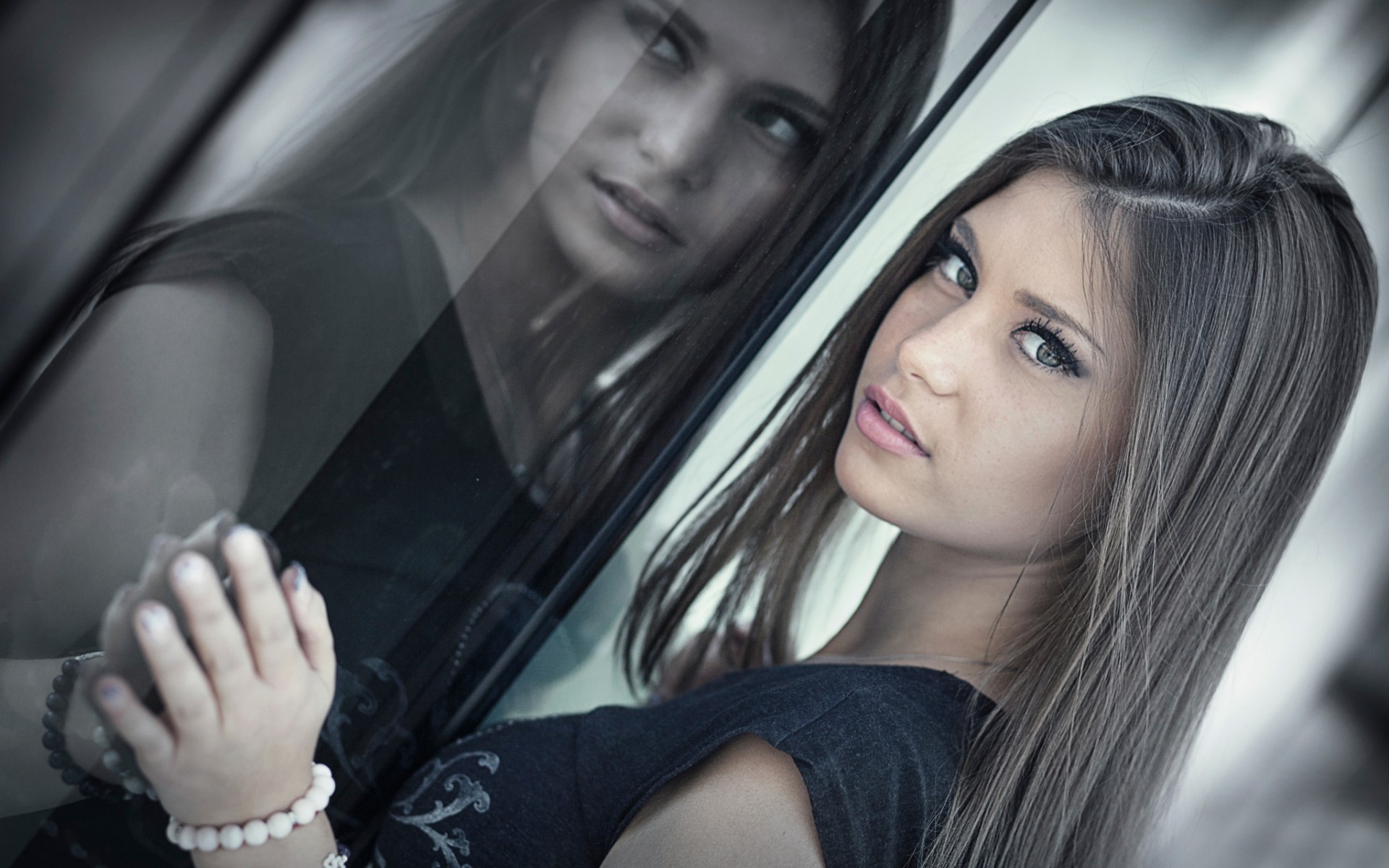 Description: A woman leaning out of a car window with her hand on the window handle and looking out the window.