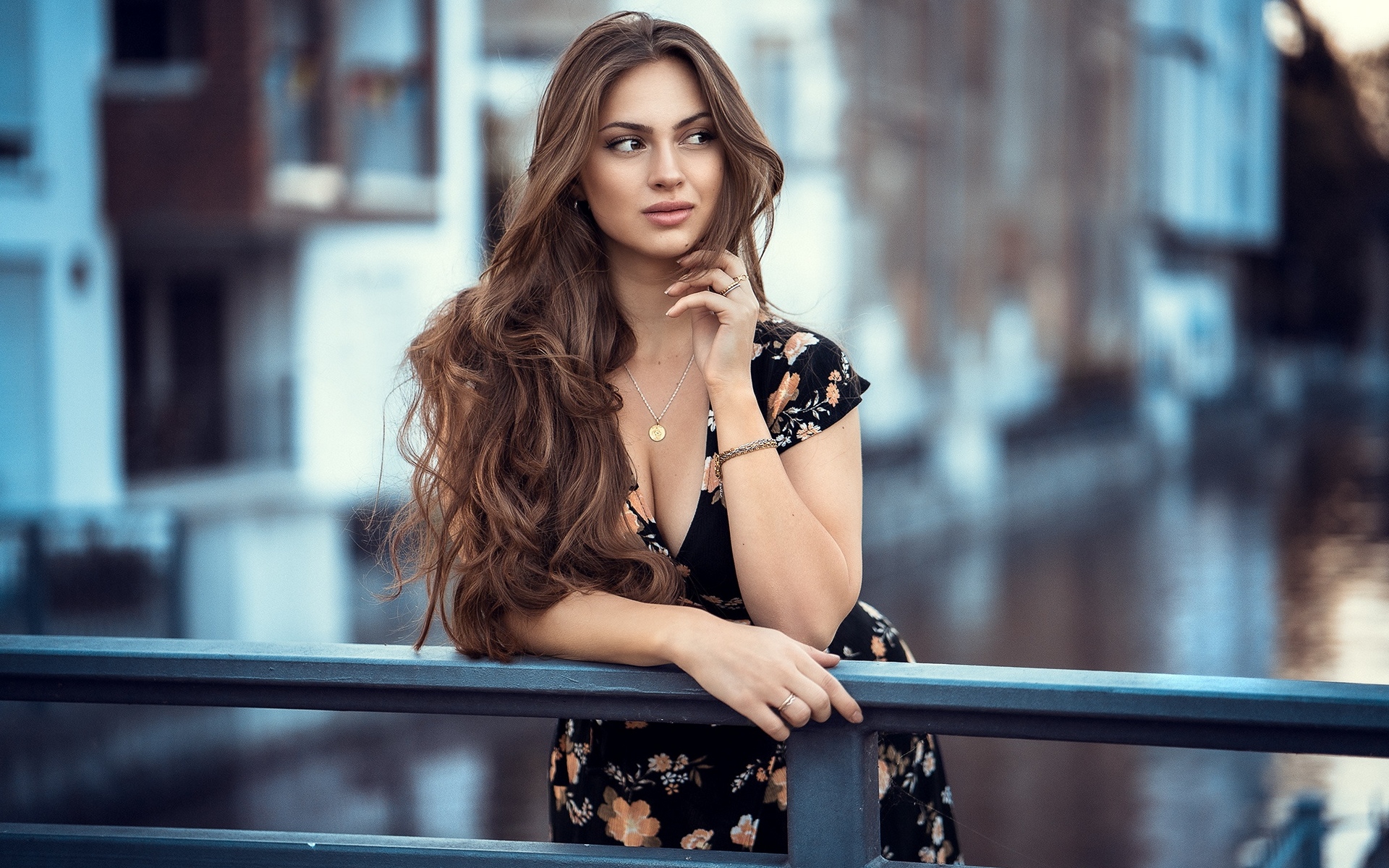 Description: A woman leaning on a rail with her hand on her chin and looking at the camera with a serious look on her face.