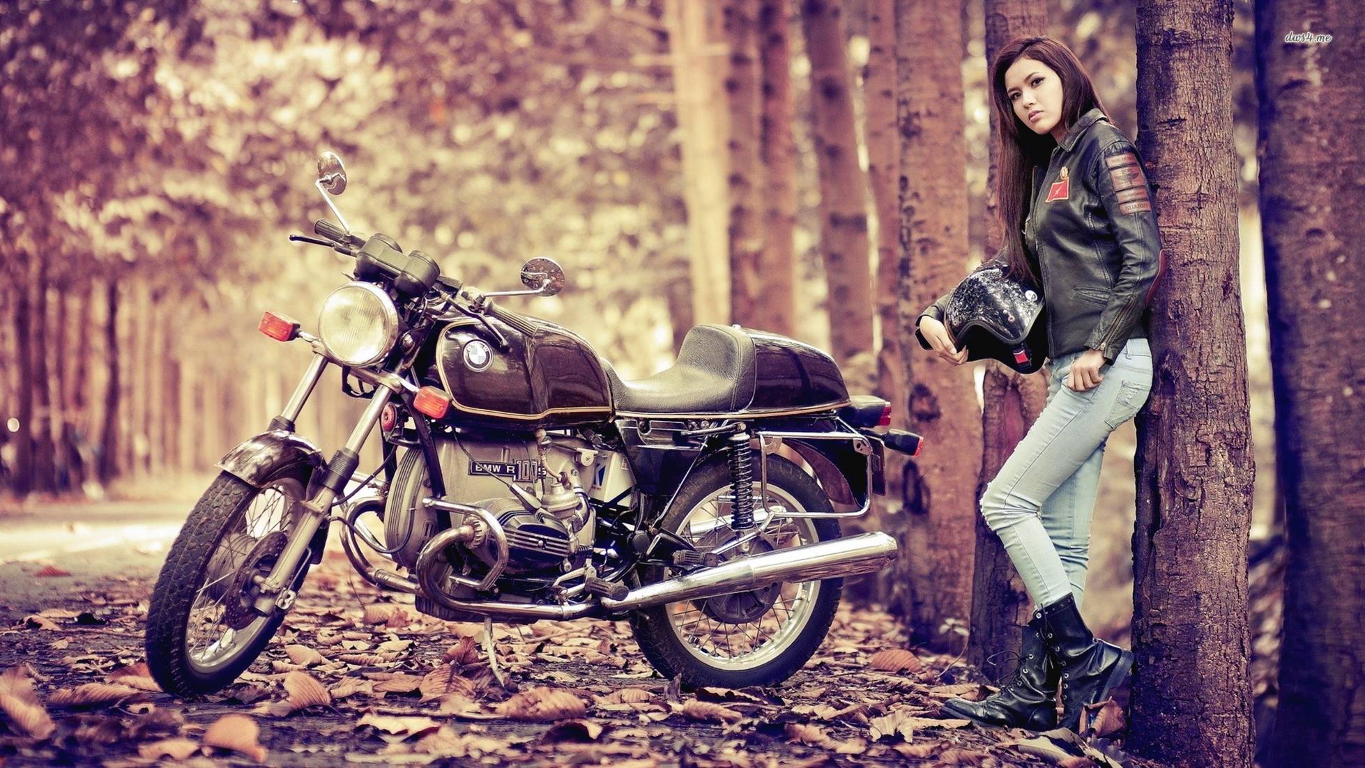 Description: A woman leaning against a tree next to a motorcycle in the woods with leaves on the ground and a tree trunk.