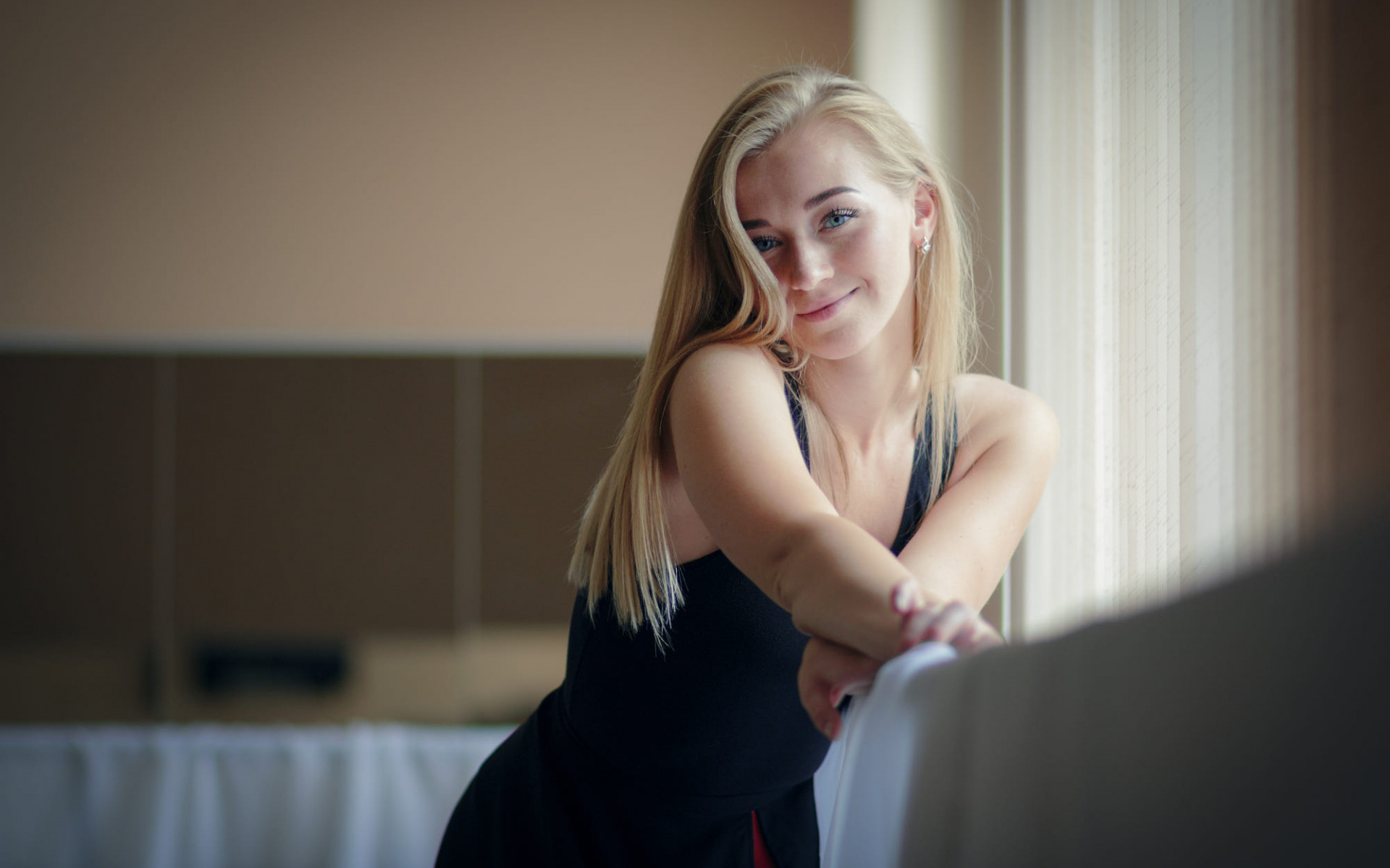 Description: A woman leaning against a wall with her arms crossed and looking at the camera with a smile on her face.