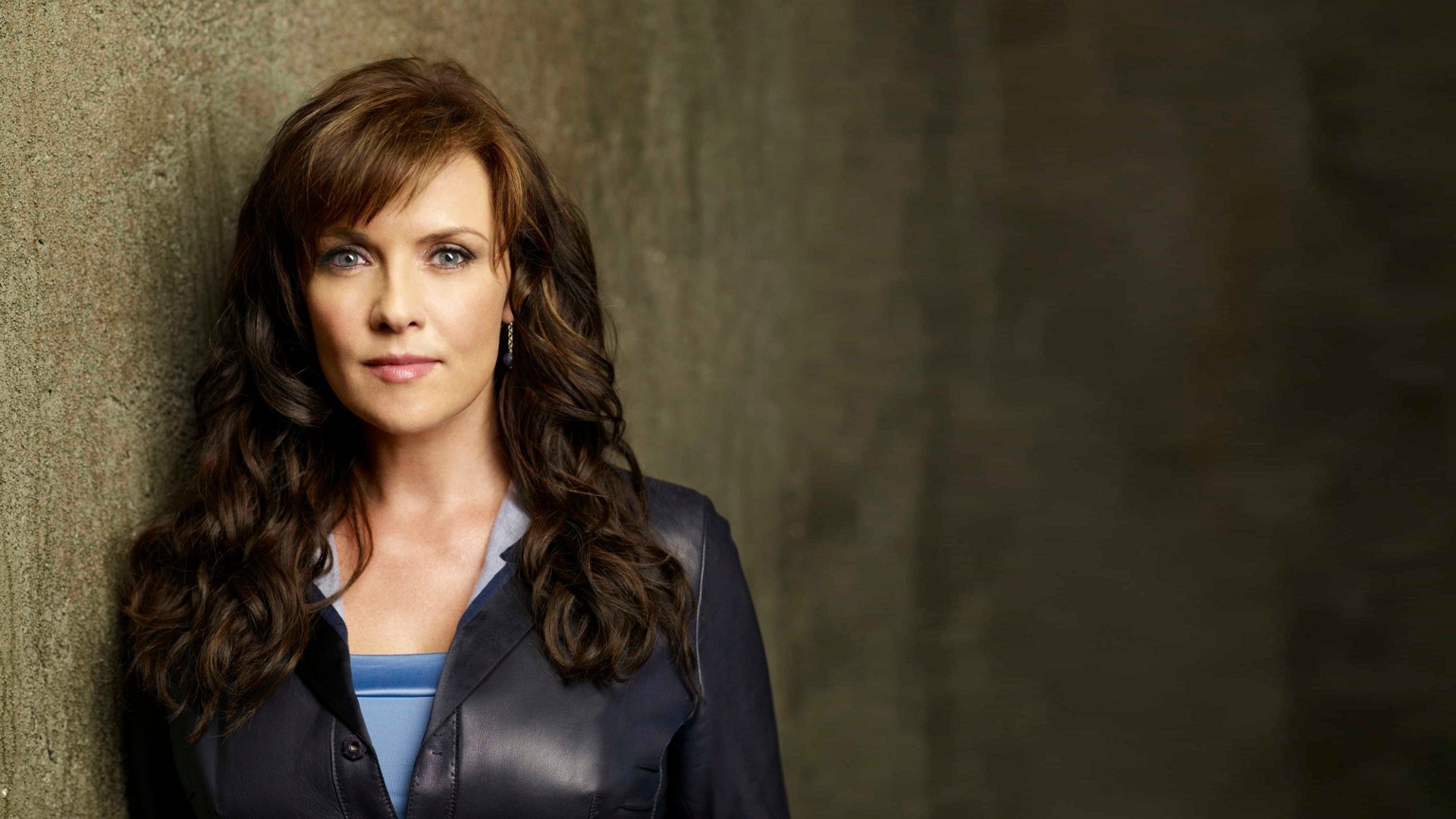 Description: A woman leaning against a wall with her eyes closed and a jacket on her shoulders and a blue top.