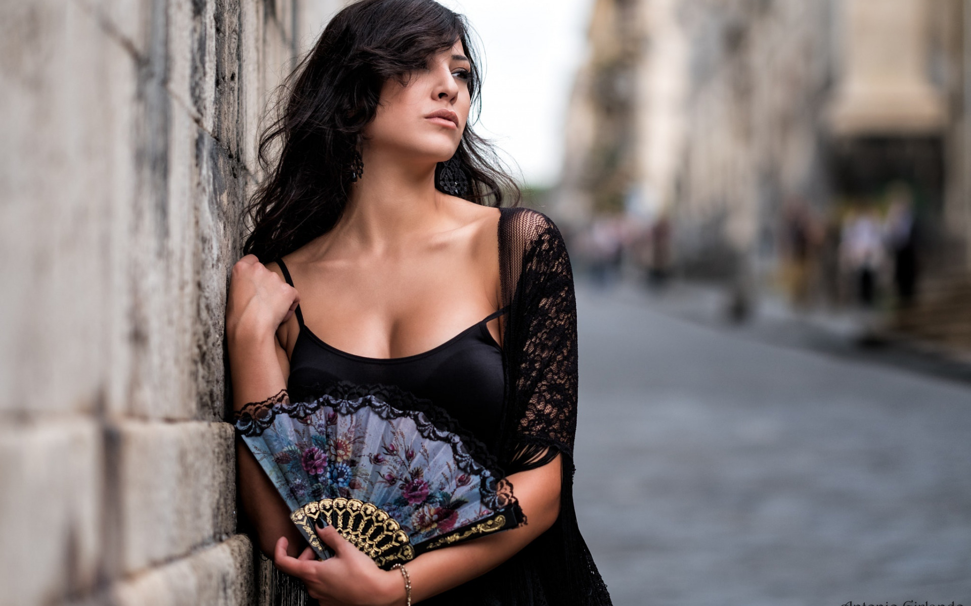 Description: A woman leaning against a wall holding a fan in her hand and looking off into the distance with a city street in the background.