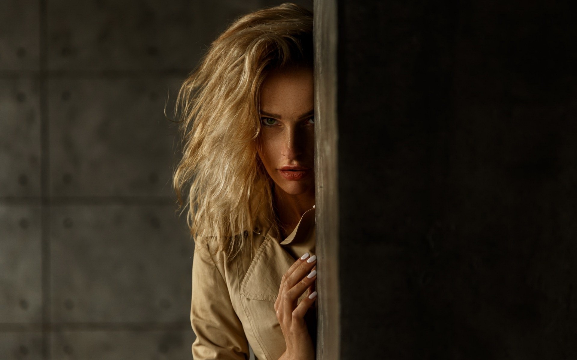 Description: A woman leaning against a wall with her hand on her face and looking at the camera with a serious look on her face.