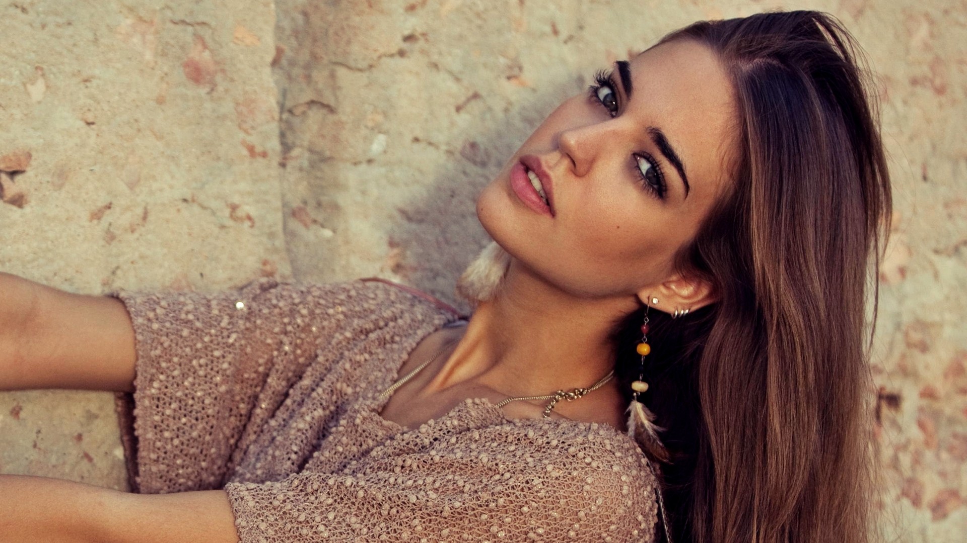 Description: A woman leaning against a wall with her hand on her hip and looking up at the camera with a serious look on her face.