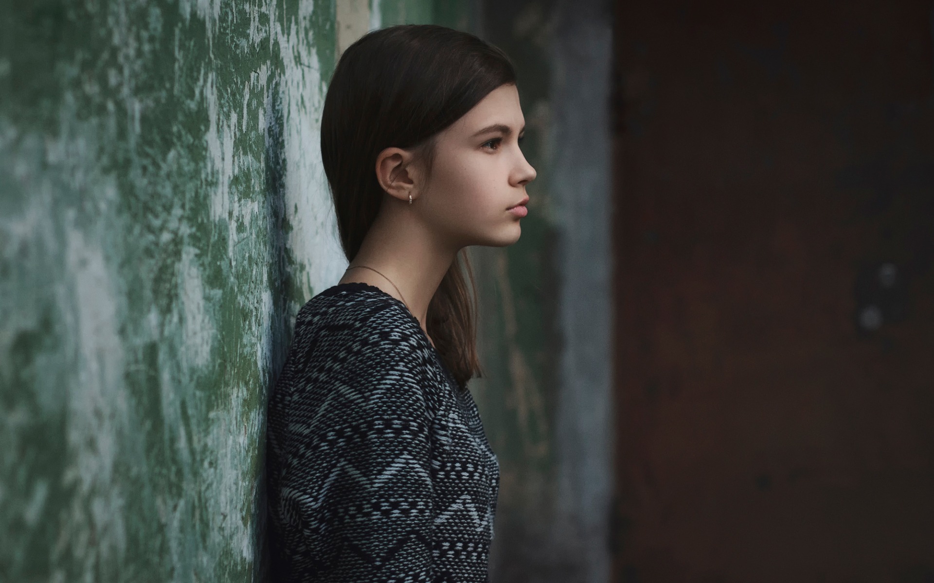 Description: A woman leaning against a wall with her head turned to the side and her eyes closed.