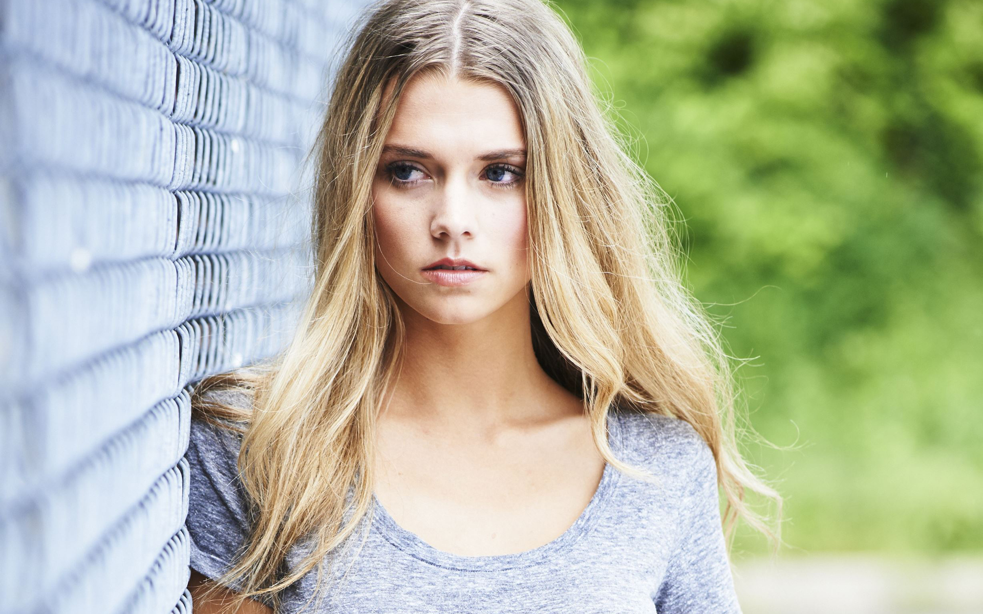 Description: A woman leaning against a wall with her hand on her hip and looking at the camera with a serious look on her face.