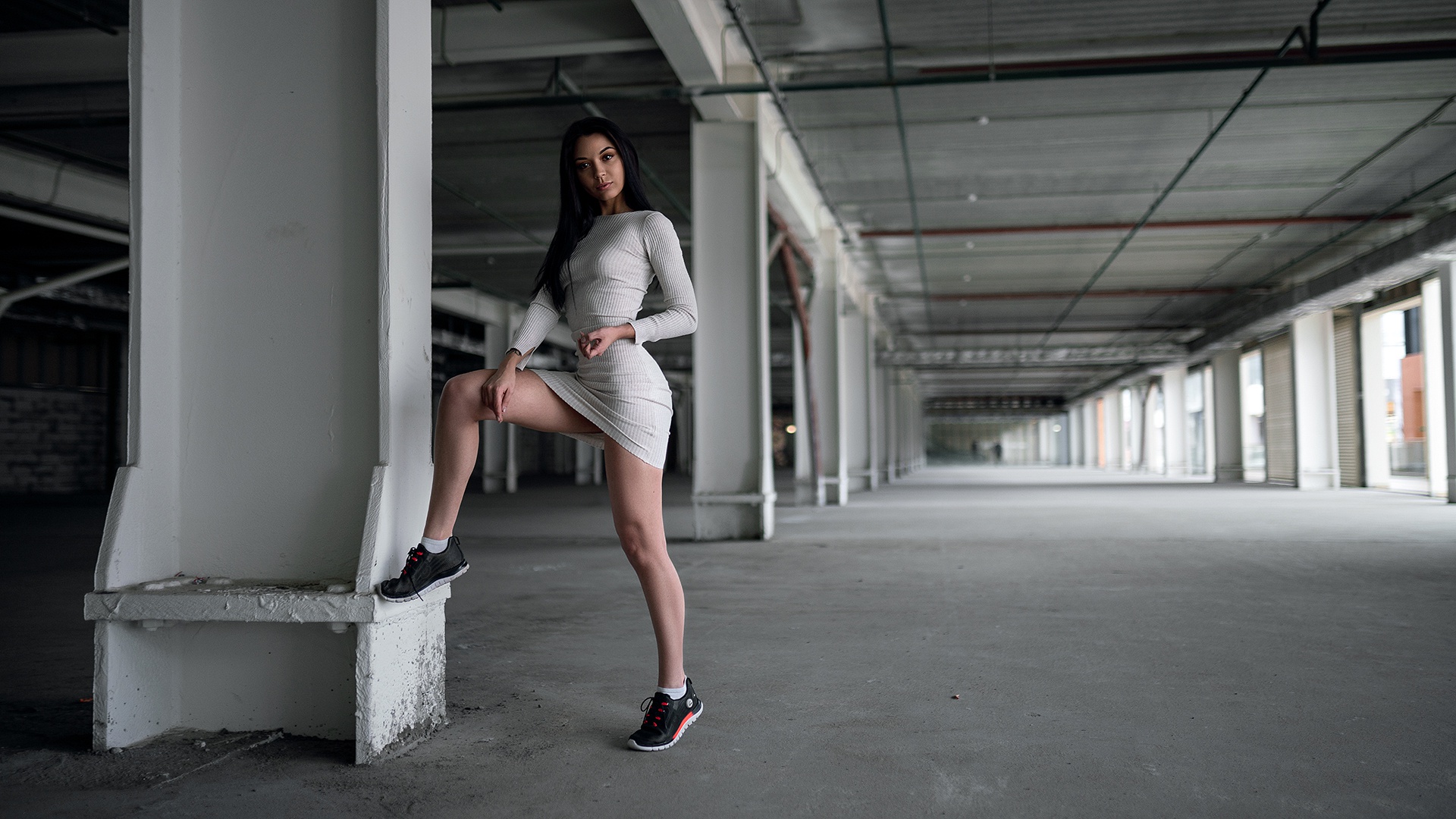 Description: A woman leaning against a wall in a building with no shoes on her feet and a white dress on.