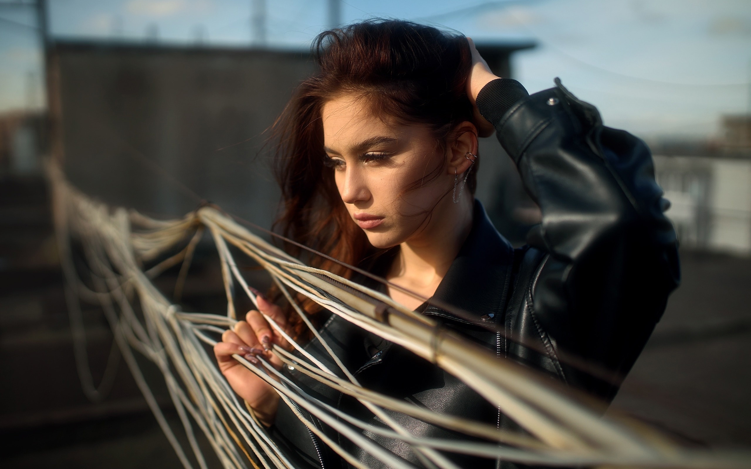 Description: A woman in a leather jacket is holding a hammock outside in the sun with her hands on her head.