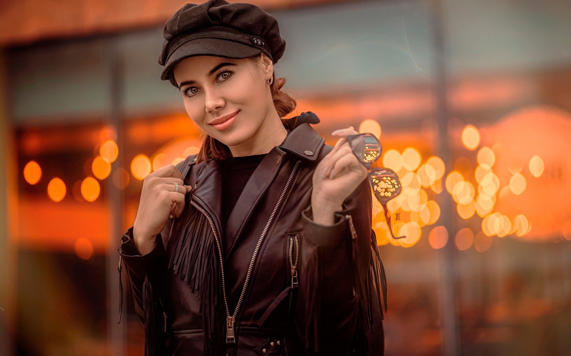 Description: A woman in a leather jacket and hat holding a small clock in her hand and smiling at the camera.