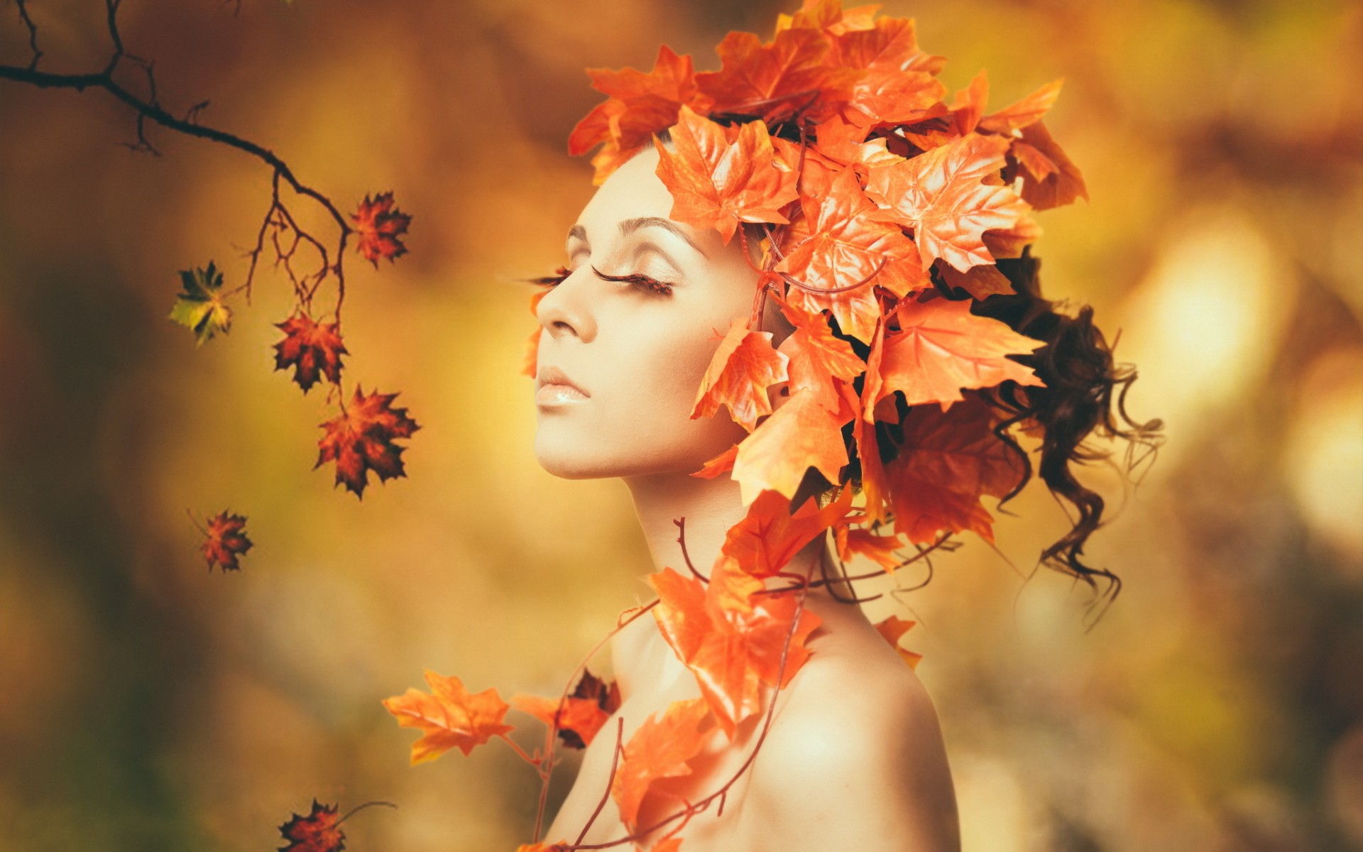 Description: A woman with leaves on her head and a tree branch in the background with leaves on her head and branches in the foreground.