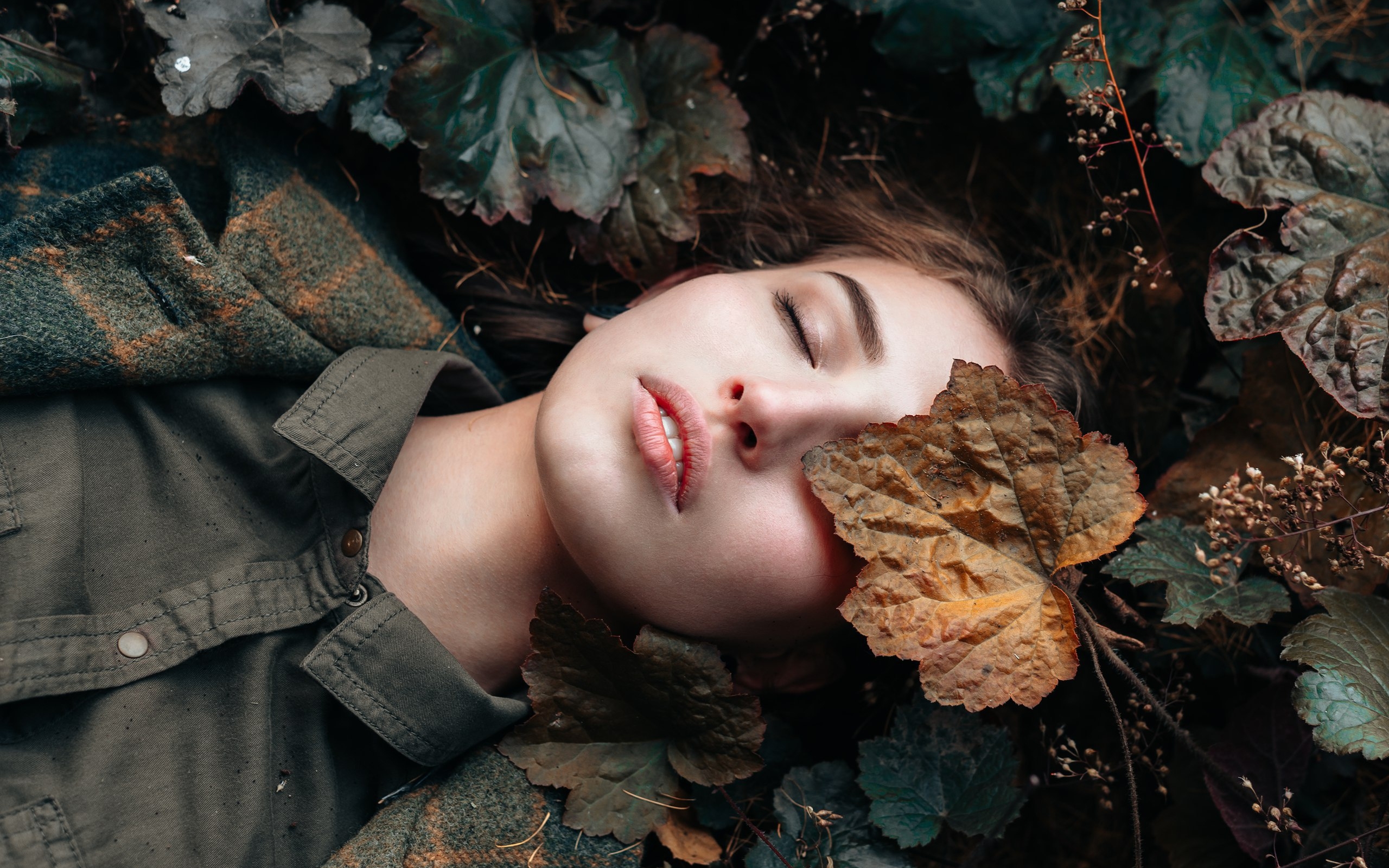 Description: A woman laying down in leaves with her eyes closed and eyes closed.