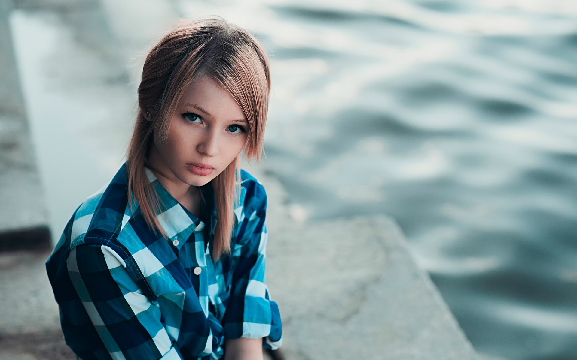 Description: A woman sitting on a ledge next to a body of water with her hands on her hips and looking at the camera.