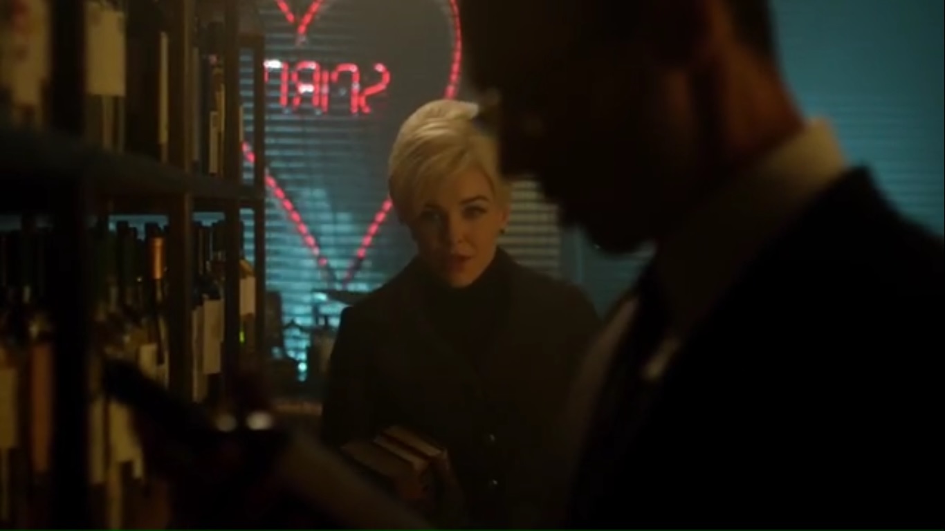 Description: A woman standing in a library next to a man in a suit and tie and a heart shaped sign.