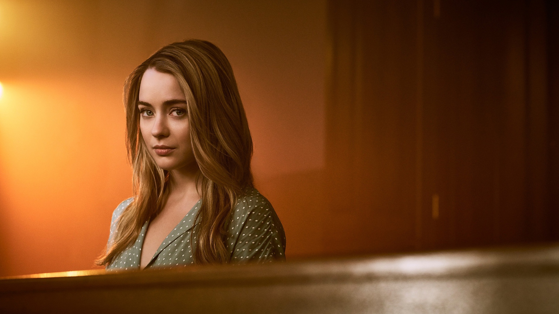 Description: A woman standing in a room with a light on her head and a lamp on the wall behind her.