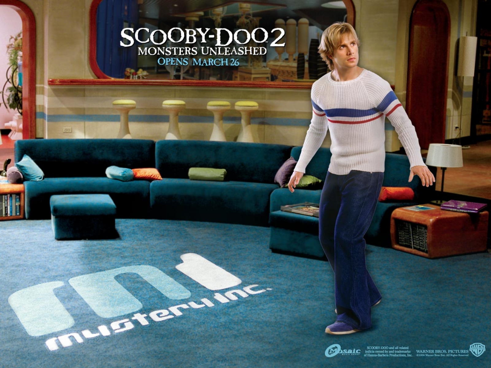 Description: A woman standing in a living room with a couch and a television set in the background and a logo on the floor.