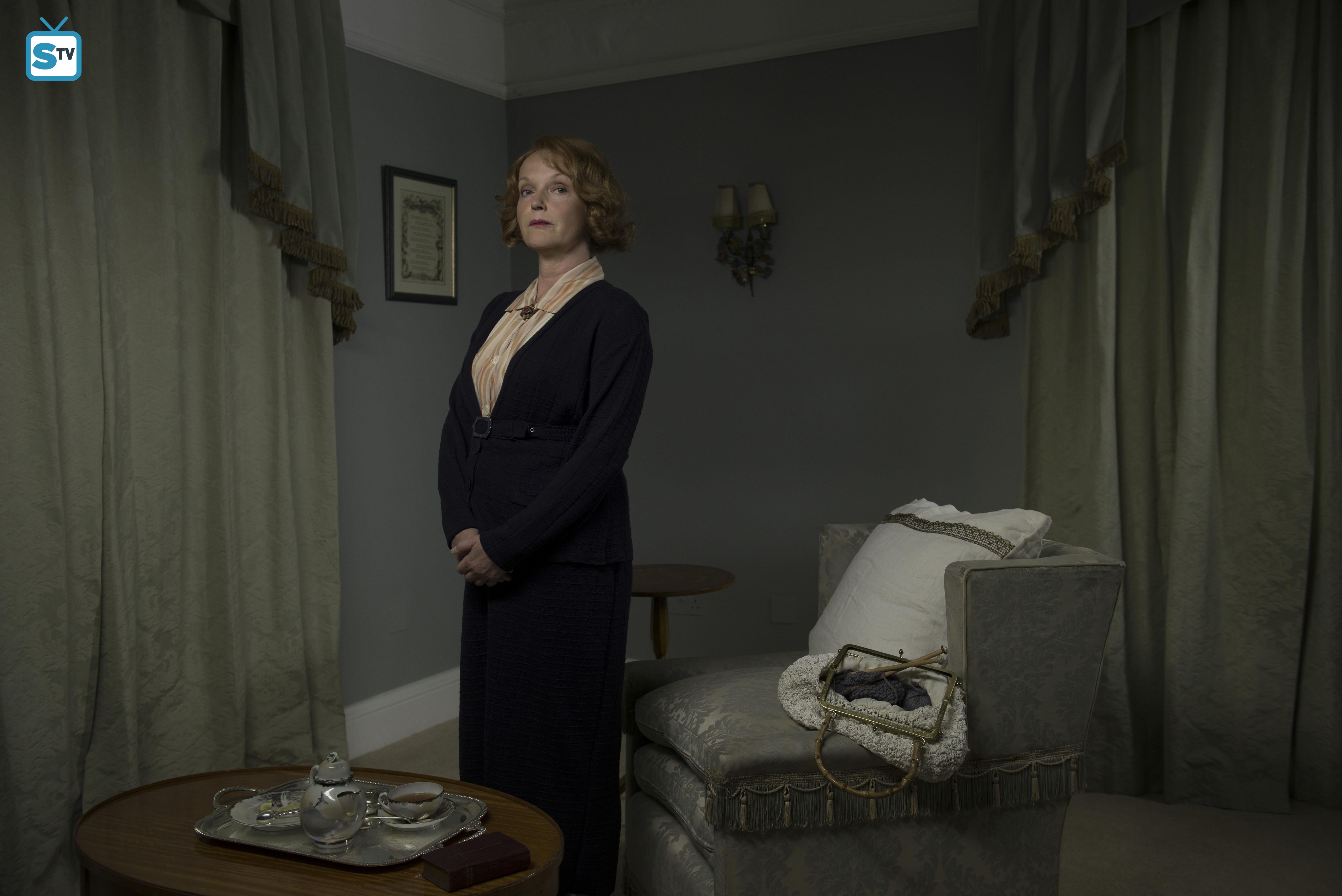 Description: A woman standing in a living room next to a chair and a table with a cup of coffee on it.