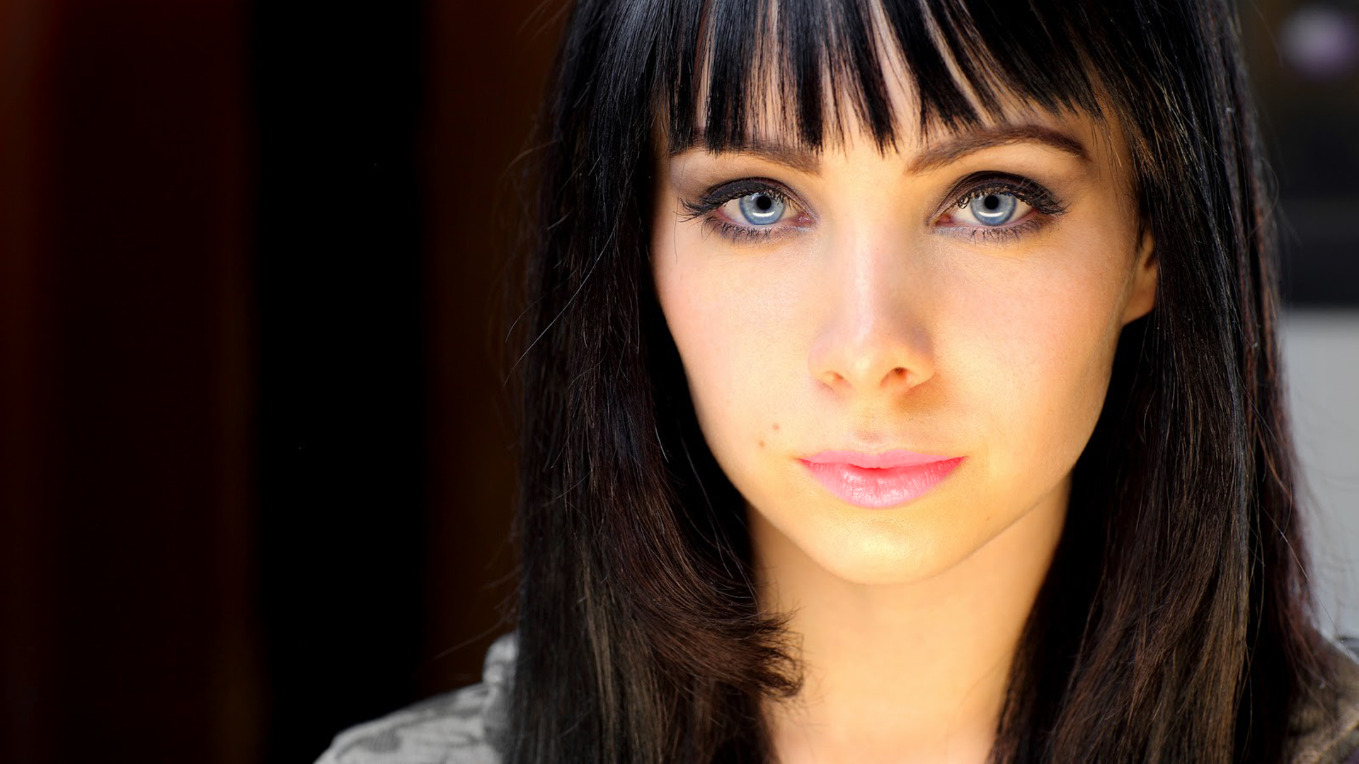 Description: A woman with long black hair and blue eyes looks at the camera with a serious look on her face.