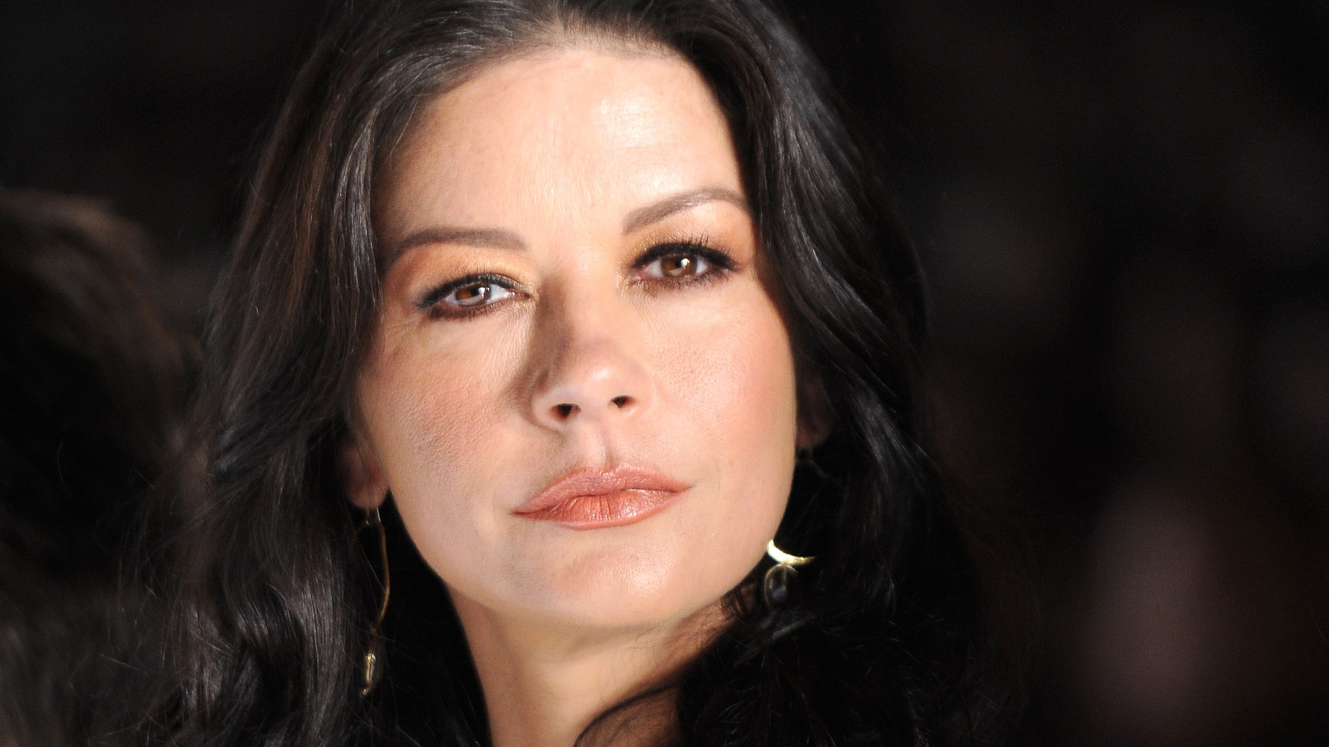 Description: A woman with long black hair and a pair of earrings on her ear and nose.