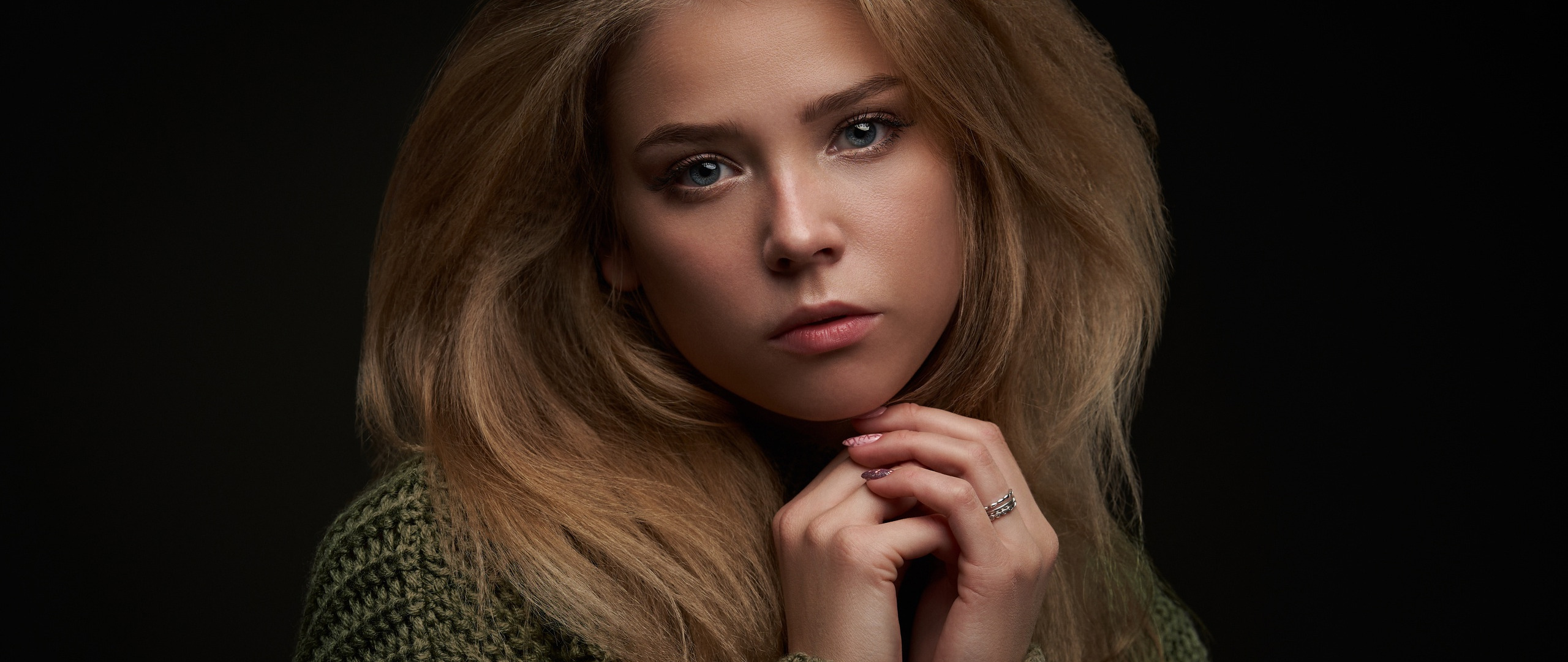 Description: A woman with long blonde hair posing for a picture with her hand on her chin and her hand on her chin.