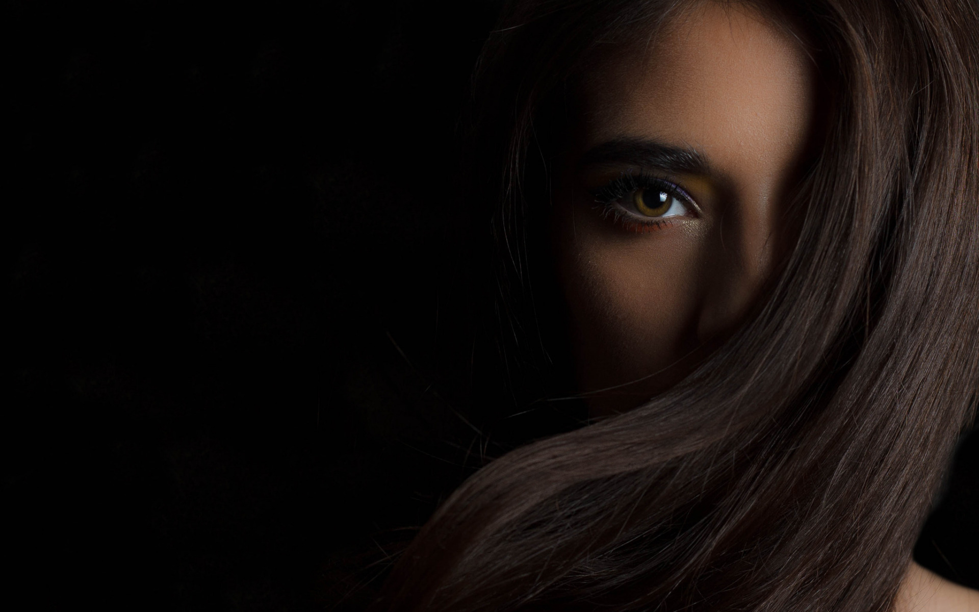 Description: A woman with long brown hair and a black background with a black background and a white background with a black background and a white background with a black background.