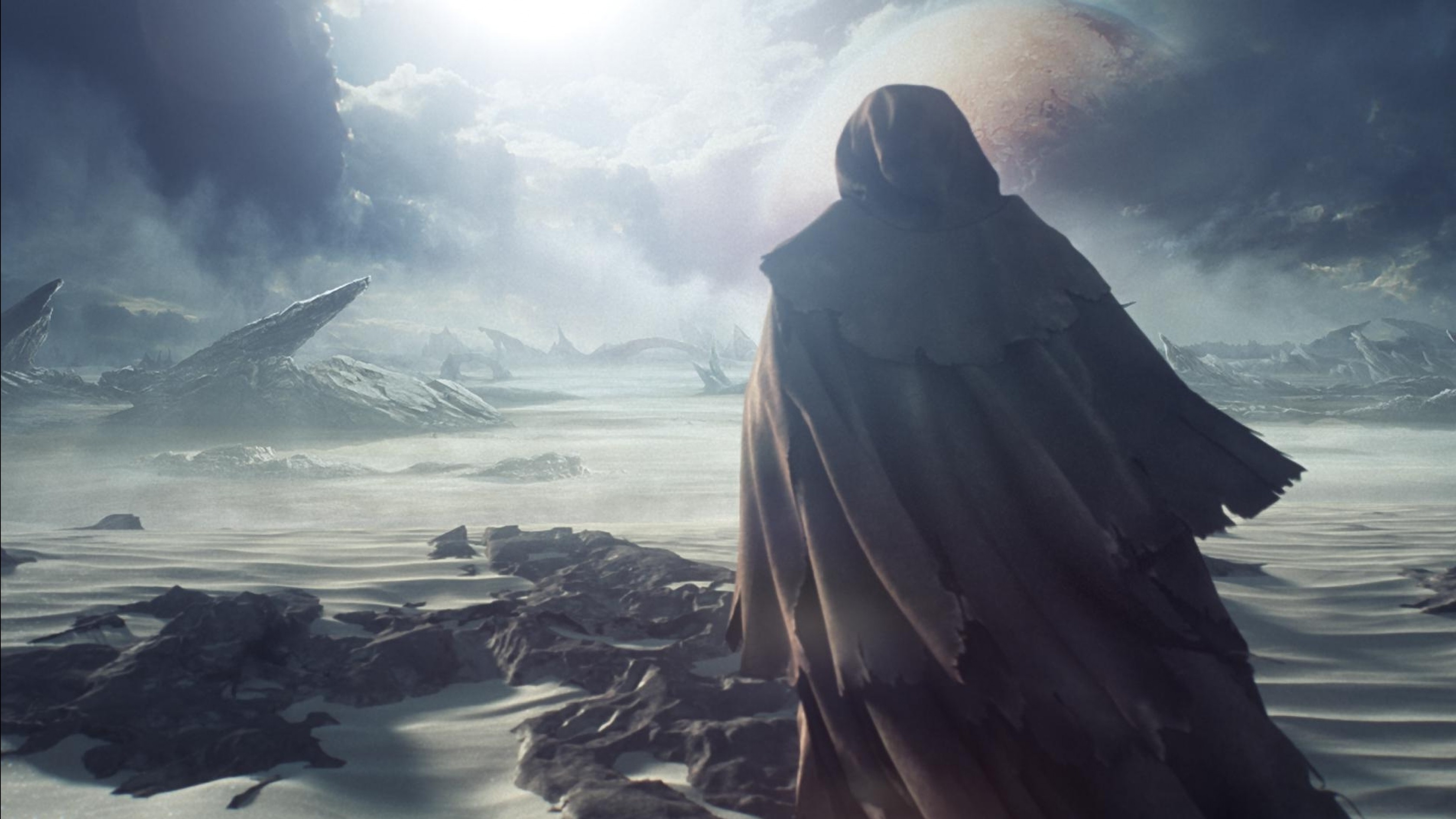 Description: A woman in a long dress standing in a desert area with a giant object in the background and a sky filled with clouds.