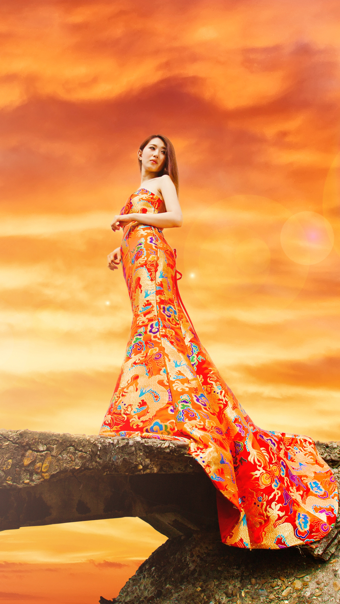 Description: A woman in a long dress standing on a rock with a sunset background and a bridge in the foreground.